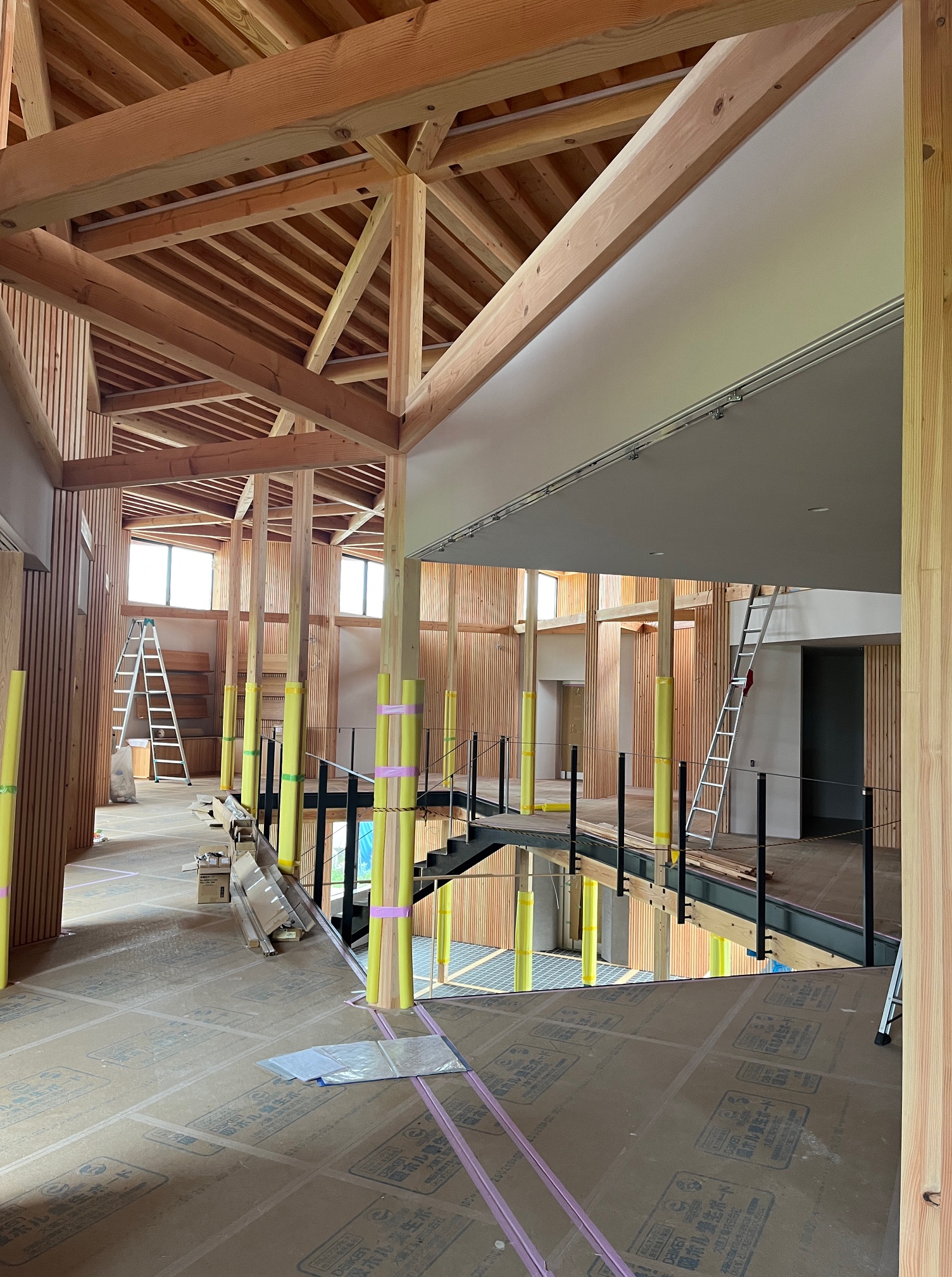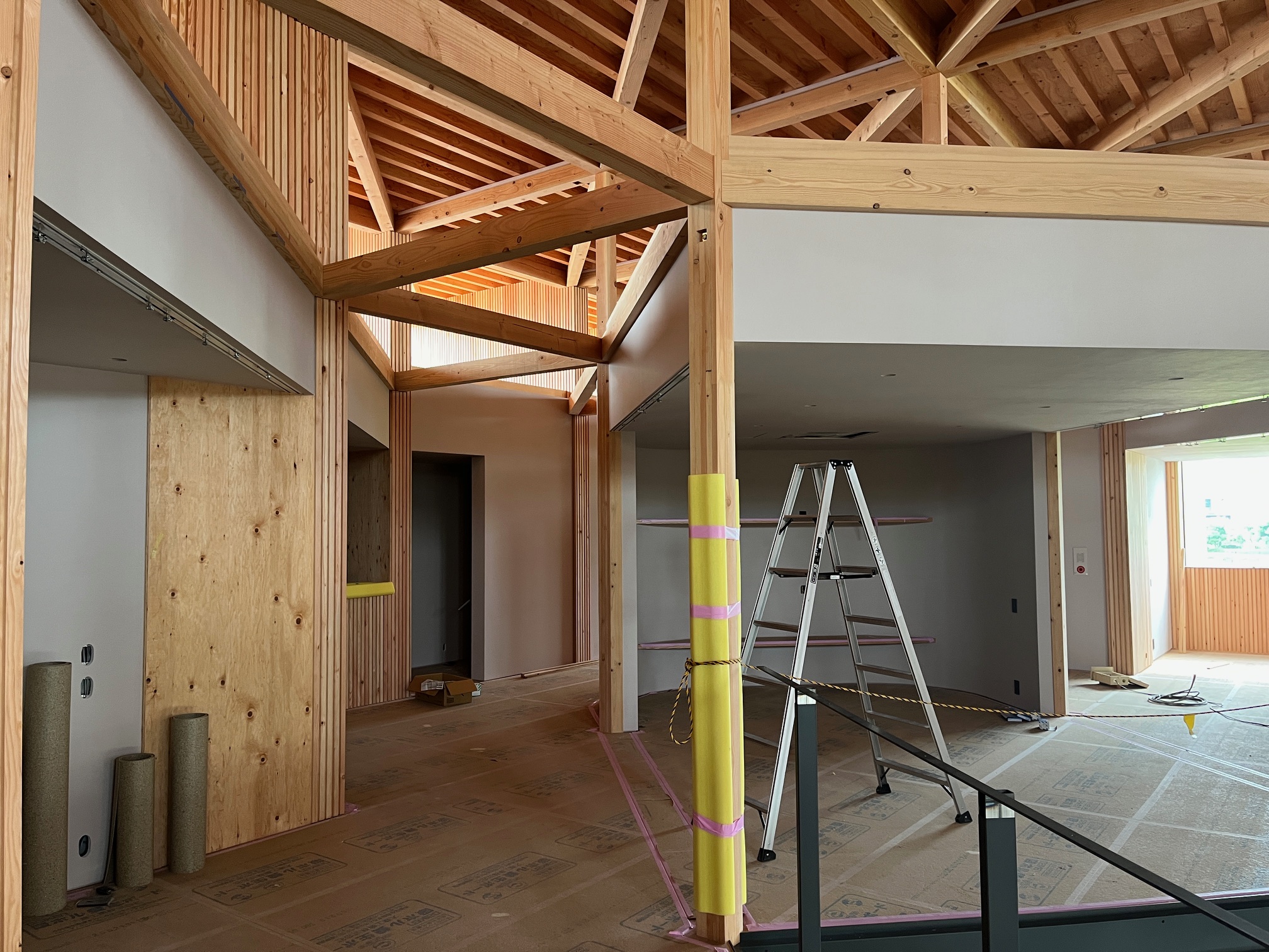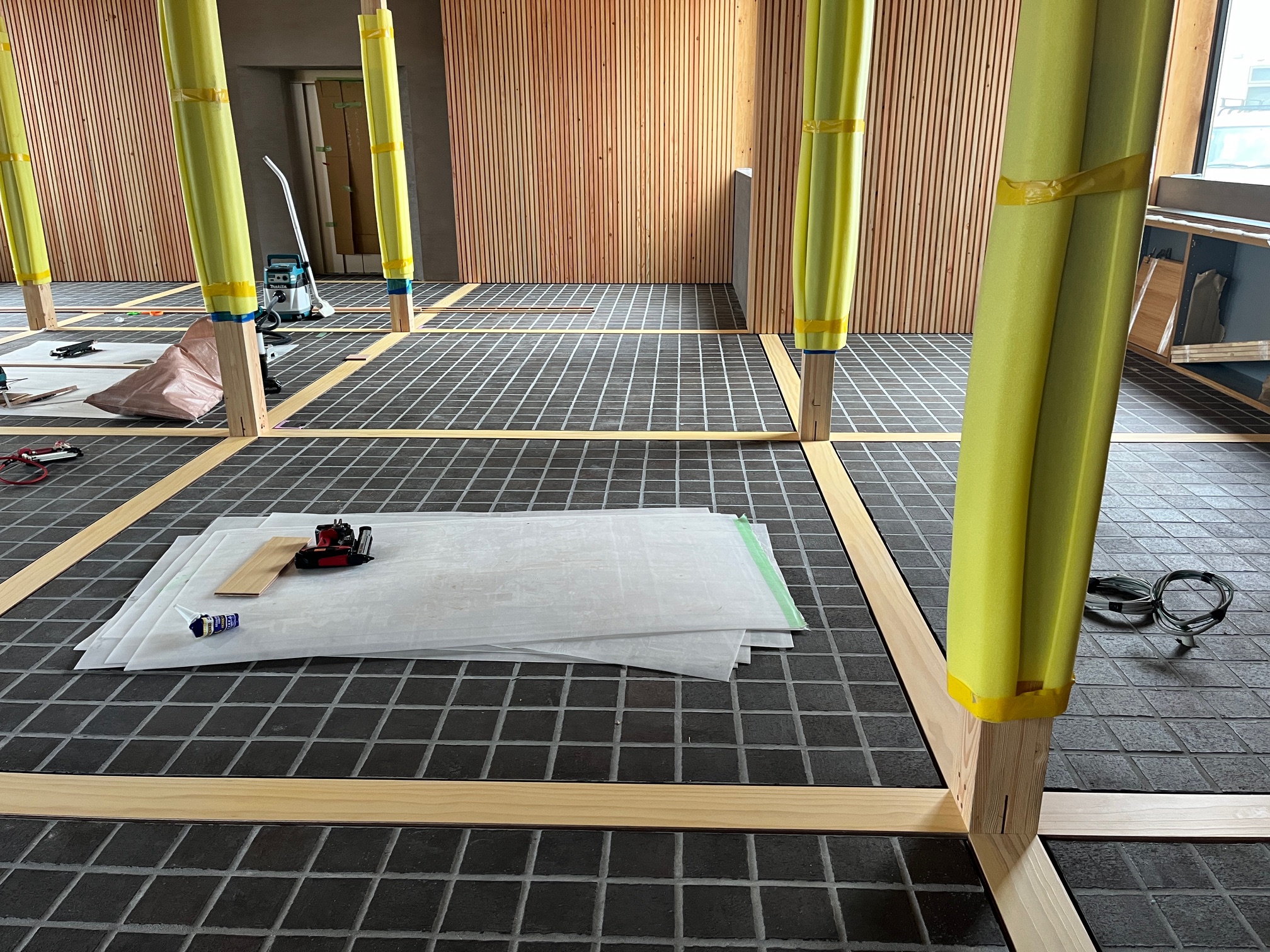こちらの写真は、前回のブログでご紹介した、着色した敷居を1階の床タイルの間に施工した様子です。タイルだけの状態と比べると、柱と柱をつなぐ敷居の線が際立ち、グリッドとしての一体感が生まれた印象を受けます。