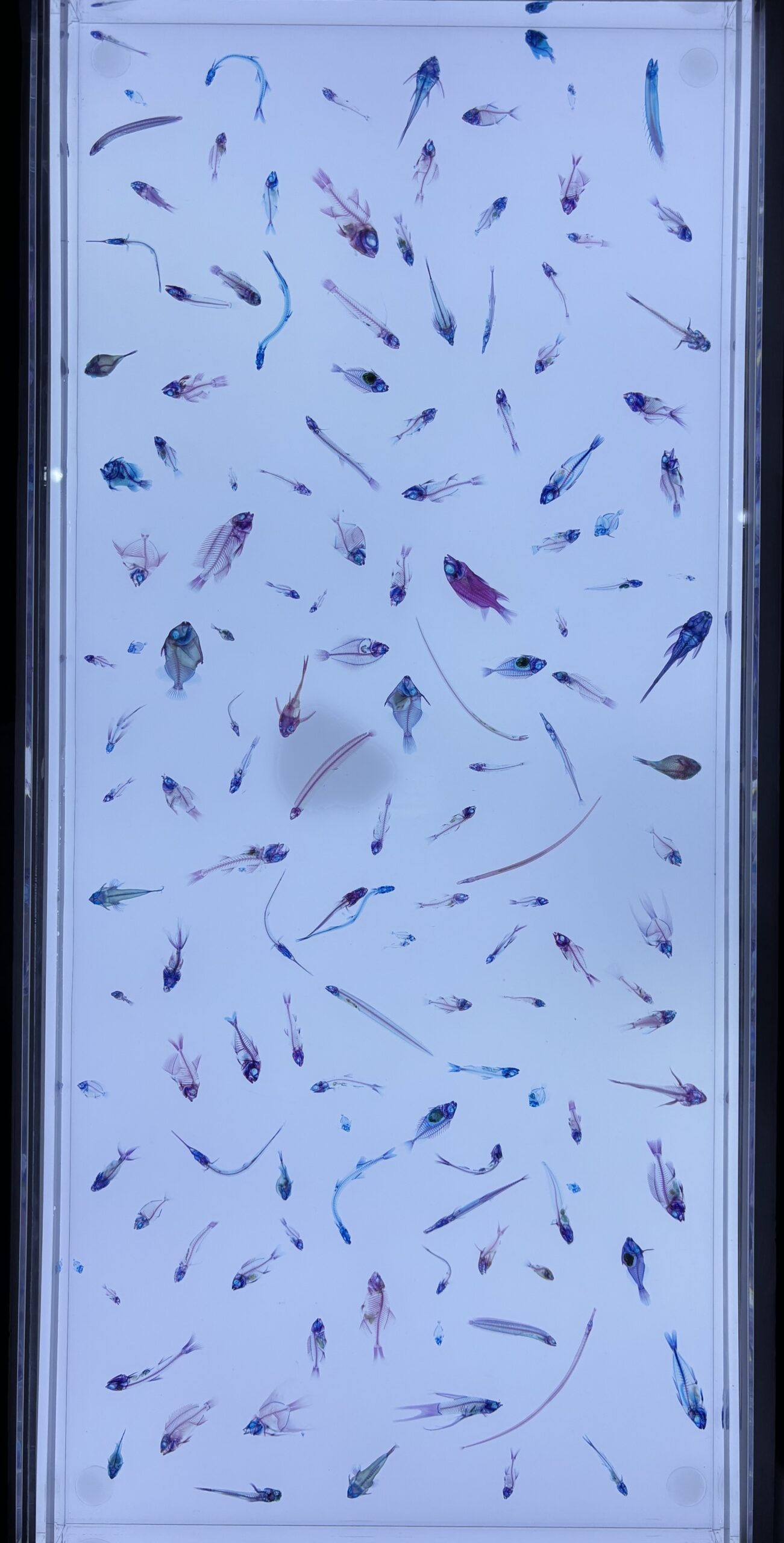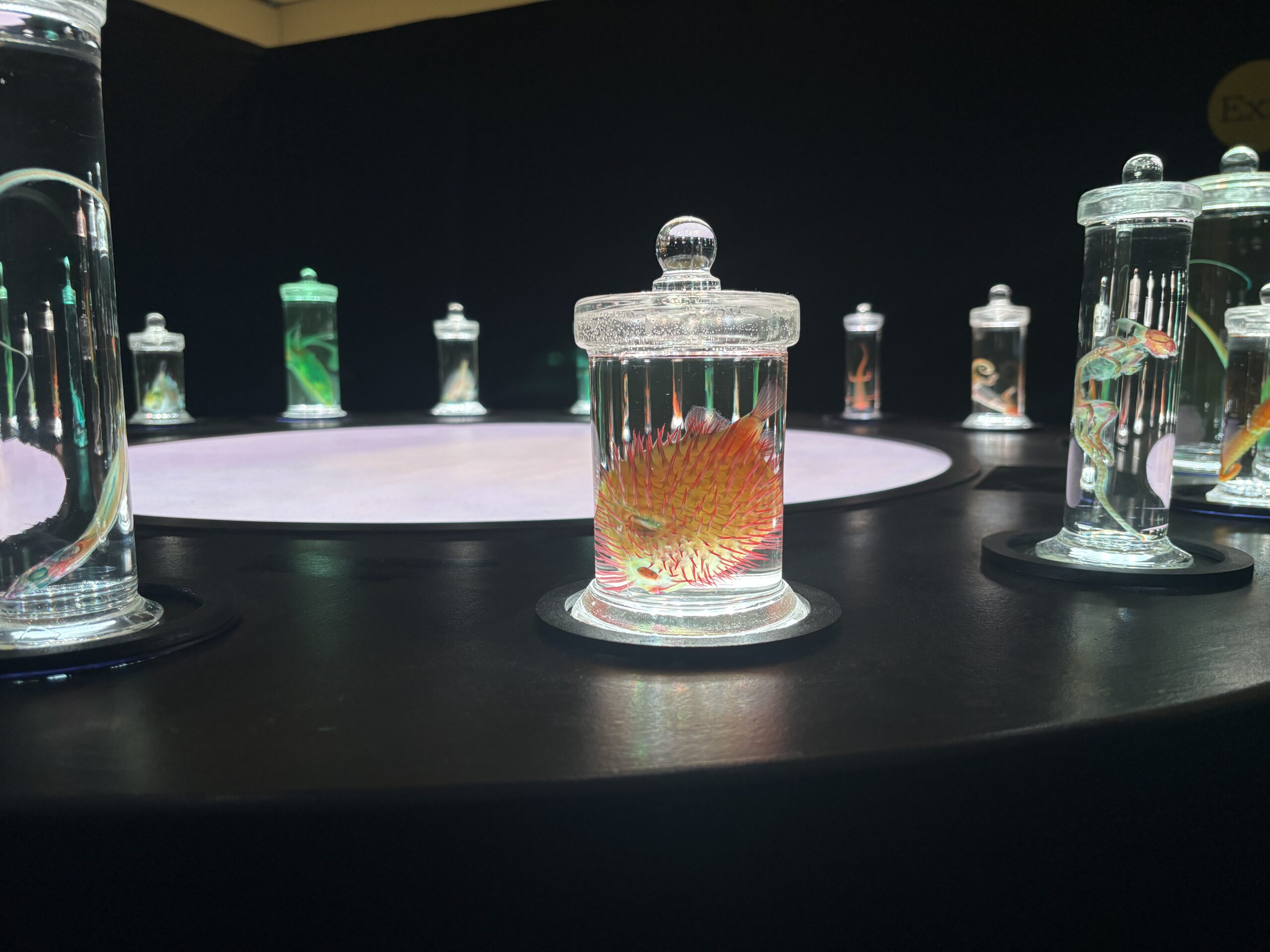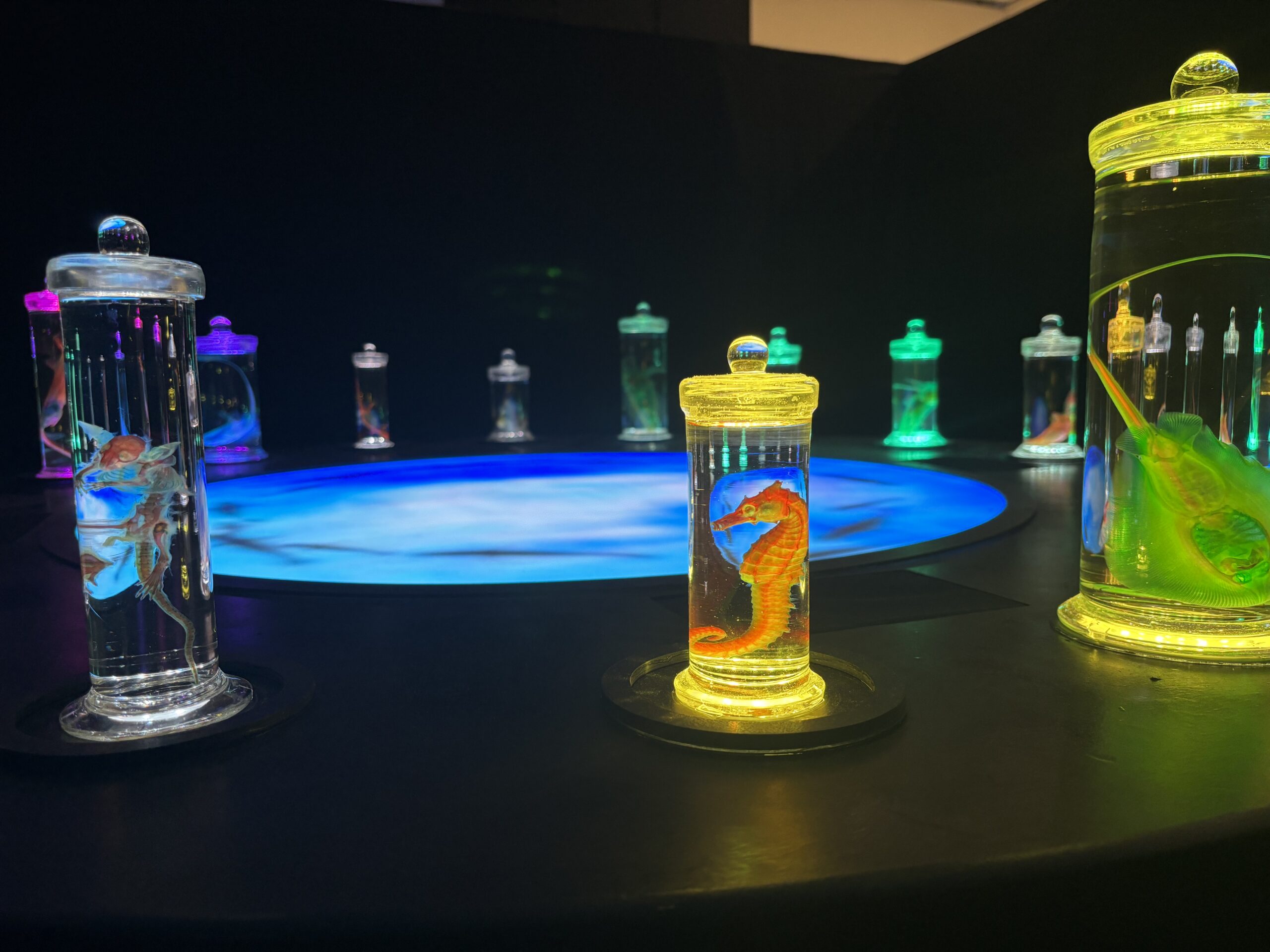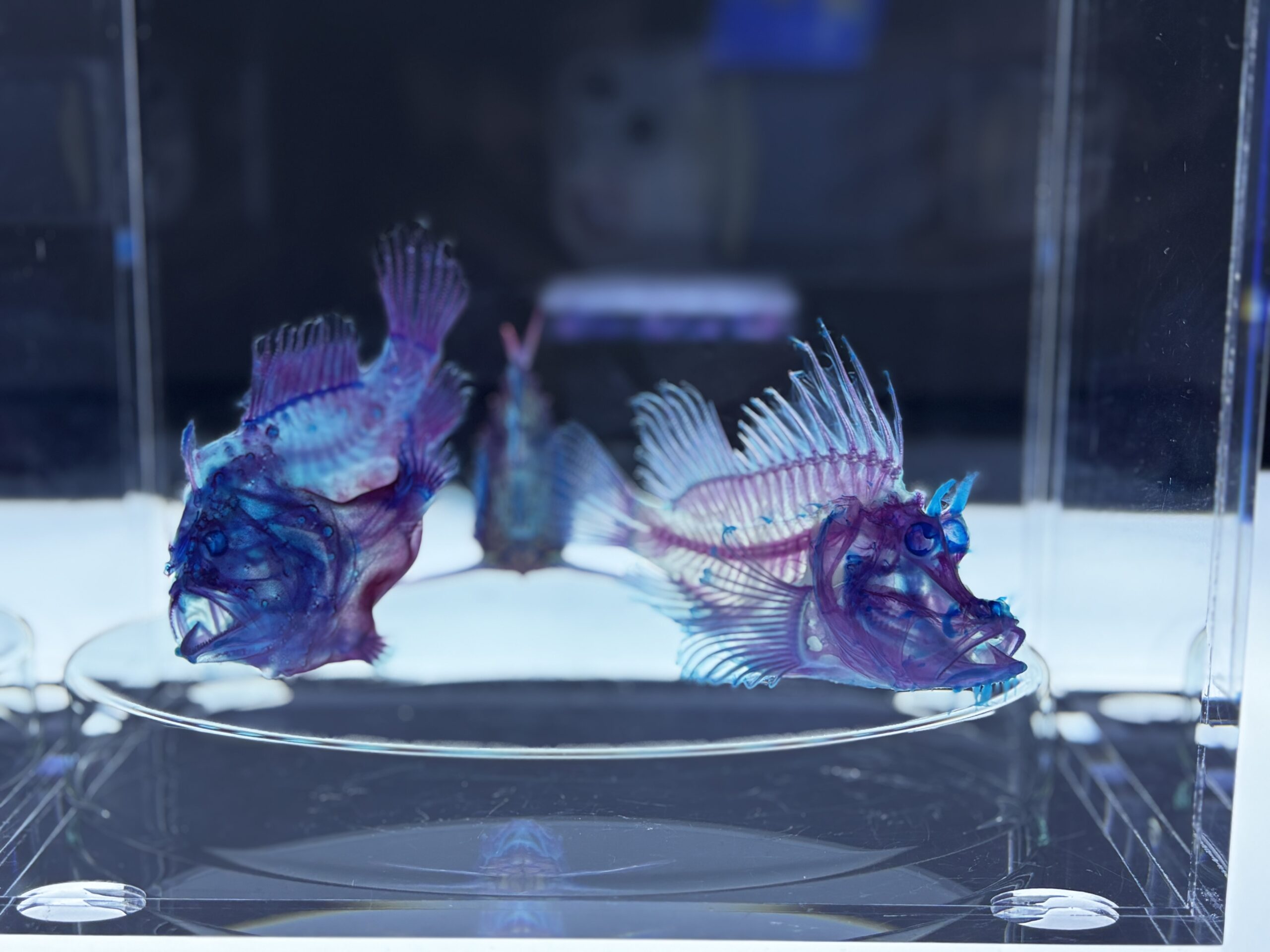 光に浮かび上がる魚や生き物たちの標本は、美しく、どこか幻想的。