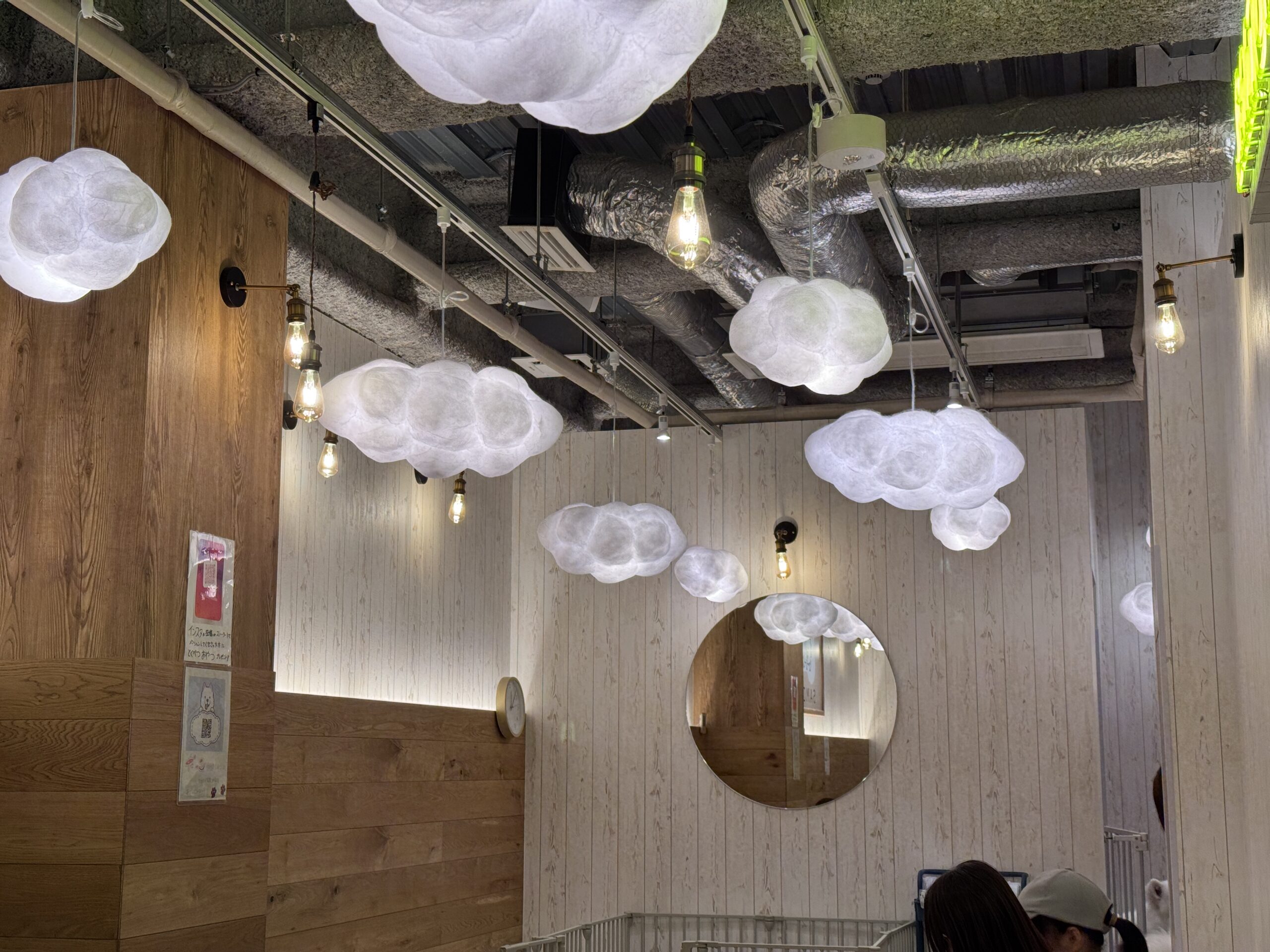 頭上には雲の形の照明がゆらりと浮かび、サモエドのふわふわ感と不思議なほど相性がいいです💛