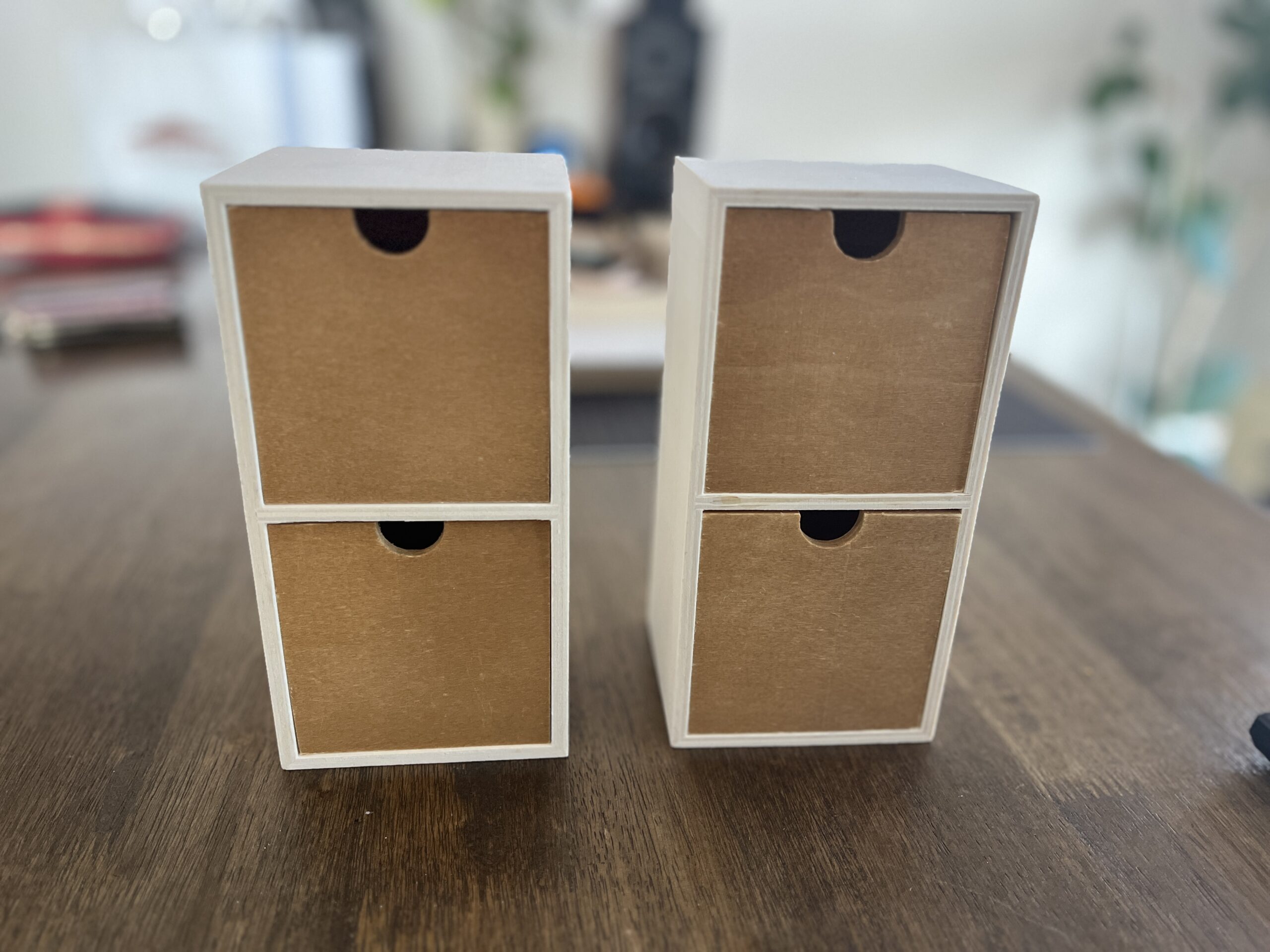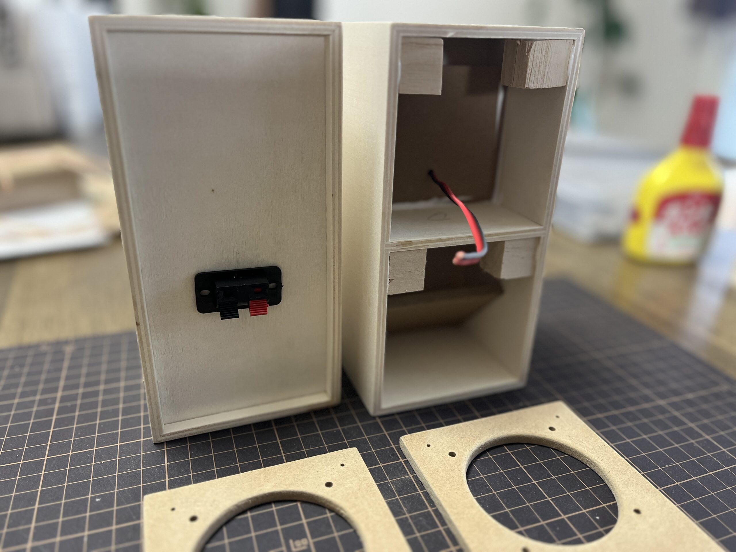 切り出したMDFと収納箱の仕切りを組み合わせ、内部に音道(バックロード)を形成。