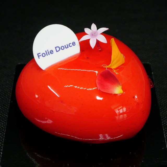 ムース系の季節ものケーキ:フルーツの酸味を活かしたバランスの良いムースやジュレが印象的。赤いハート形のムースなど、ビジュアルも楽しい一品がありました。