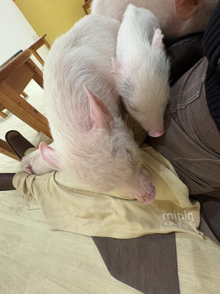 想像以上に人懐っこくて、ミニブタたちが膝の上でお団子状態に✨