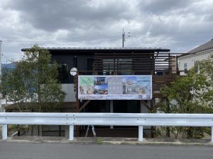 今日は、同じ部署の羽原さんと寺家にあるモデルハウス’’EDIT HOUSE’’に横幕を取り付けました。