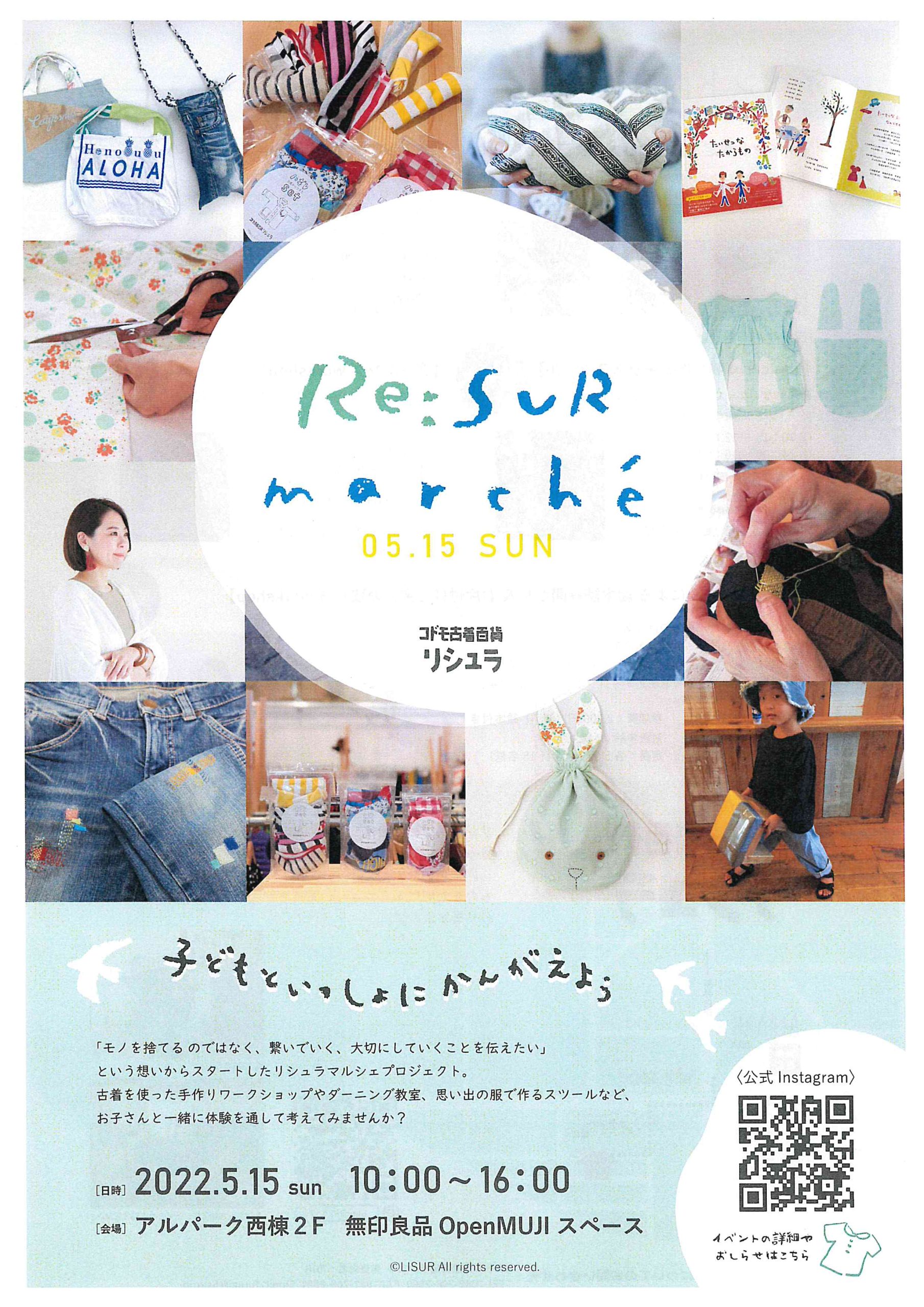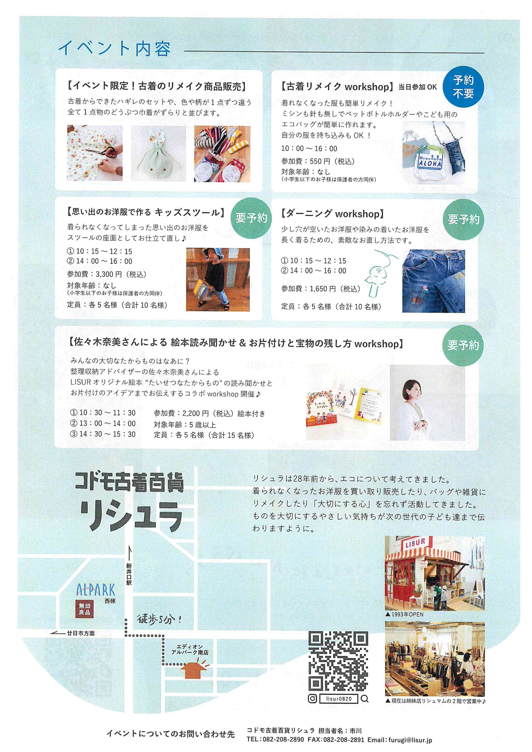 今週の15日にはコドモ古着百貨リシュラさんが、古着を使った手作りワークショップやダーニング教室、思い出の服で作るスツールなどのワークショップができる、リシュラマルシェを行うそうです。