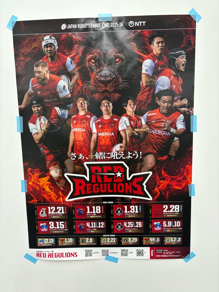 先日ありがたいことに、中国電力さんのラグビー部(中国電力レッドレグリオンズ)のポスターをいただきました。