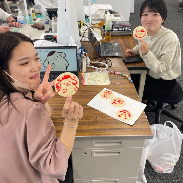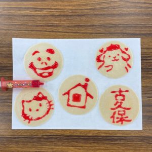 社員の皆様にもおすそ分け。水あめでイラストを描けるせんべいで遊びました(笑)