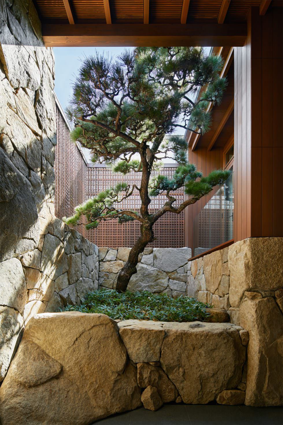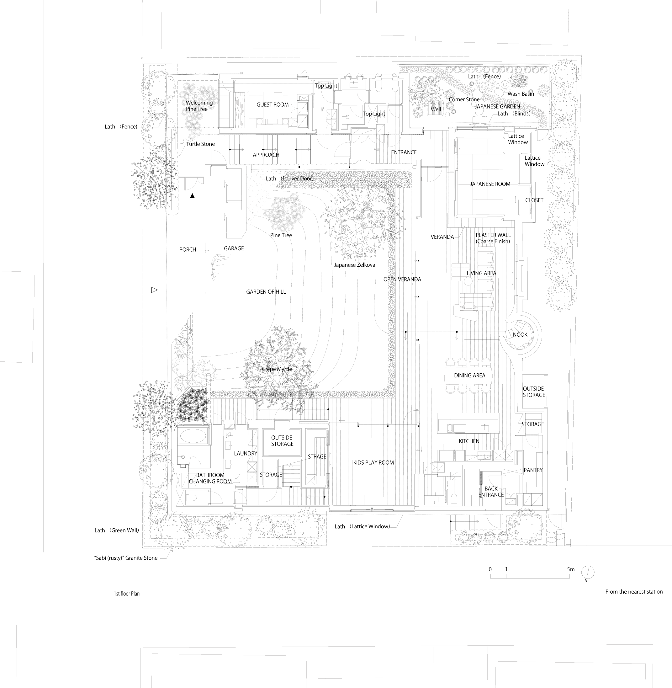 家族や来客が、庭の要素(石、葦垣、松など)を順に巡る導線を「方形渦巻(スクエア・スパイラル)」としてレイアウト。これにより、プライベートとパブリックを自然に行き来できる場をつくり出しています。