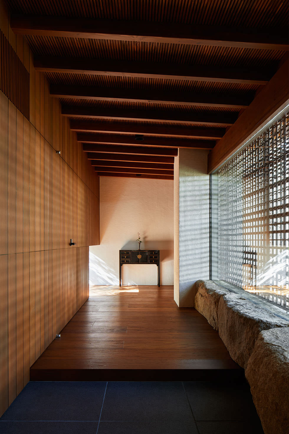 垂木(たるき):屋根構造の垂木が白い構造壁から突き出すように見え、まるで半屋外の縁側のような表情。