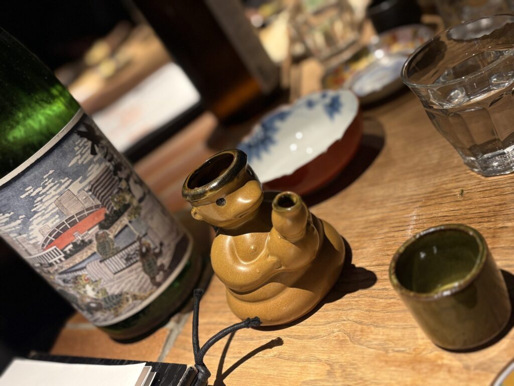 日本酒のラベルには猿猴橋と猿猴のイラストが。徳利は可愛い猿猴でした😊