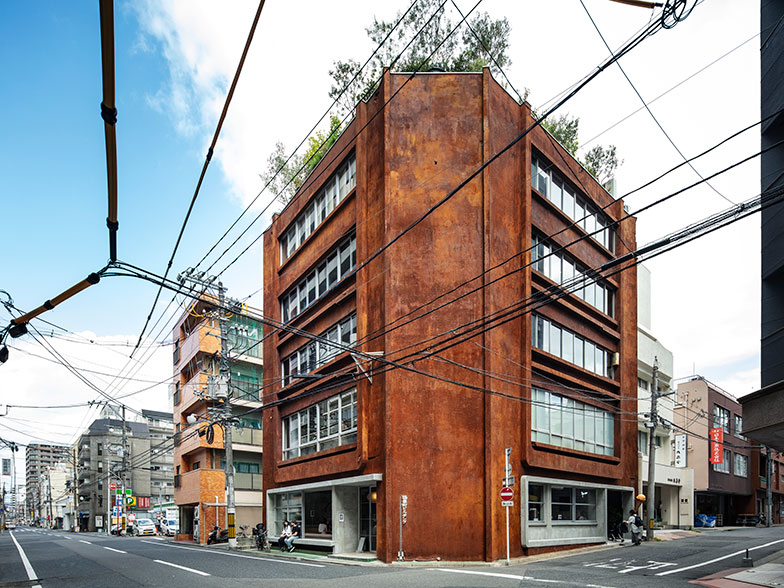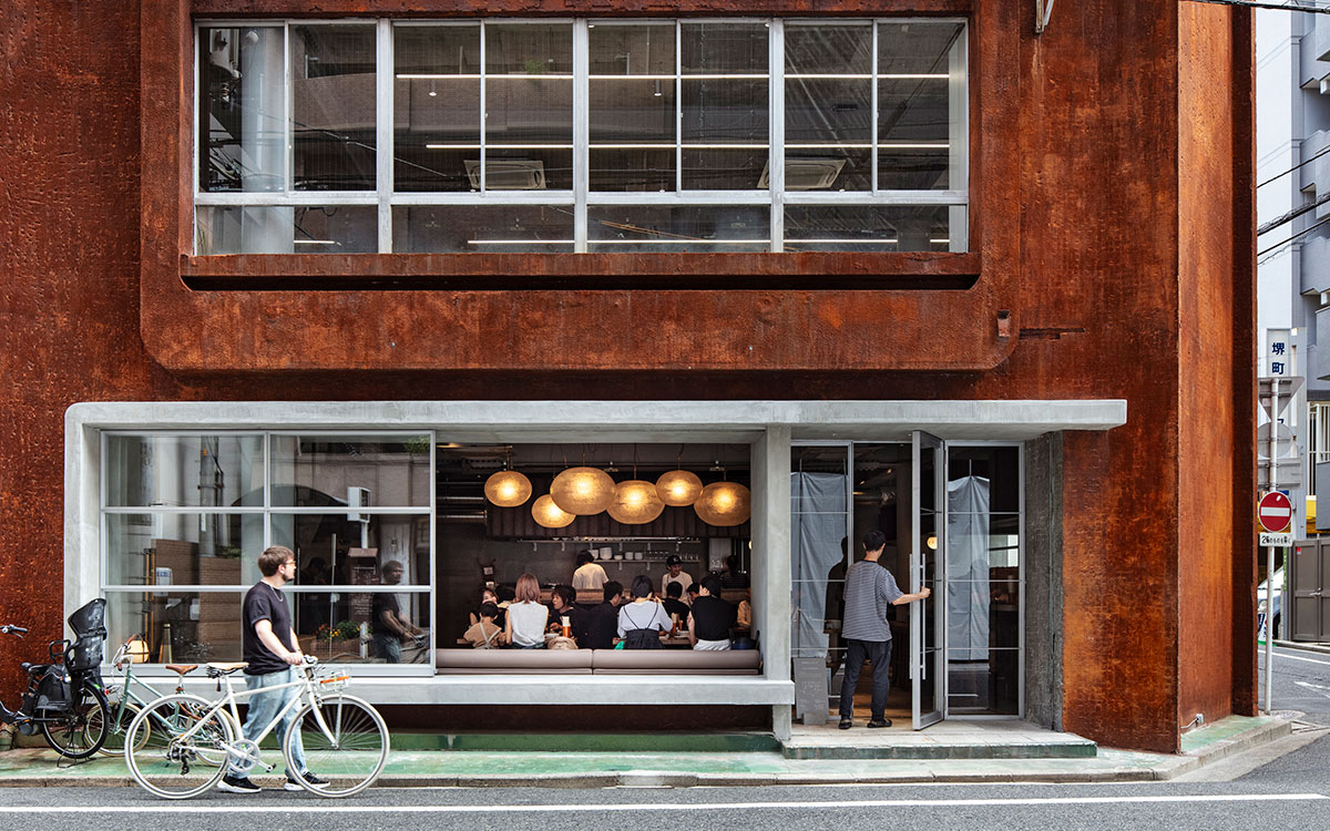 古いビルを活かしつつ、新しいデザインを融合。外壁のタイルを剥がし、コールテン鋼(錆び加工が楽しめる金属塗装)を施す等、既存の素材・意匠をできるだけ残しながら改修。