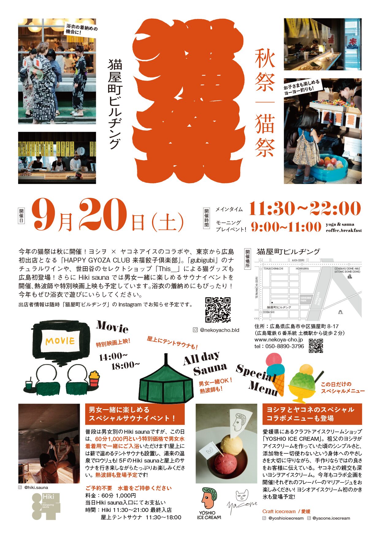 最近の開催例:2025年は「秋祭」として9月20日(土)11:30〜23:00(朝ヨガなどプレイベントは9:00〜)。屋上サウナや映画上映など多彩なプログラムが組まれました。