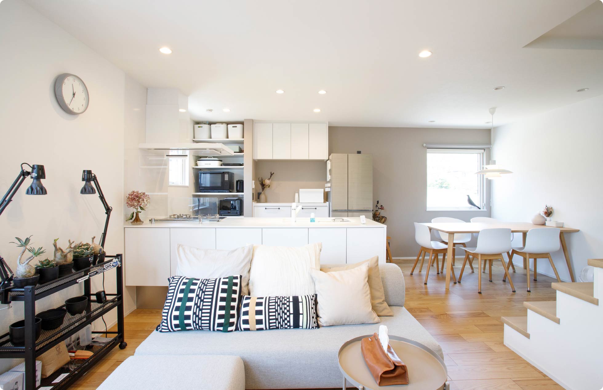 日興ホームのショールームを見て気に入った白いキッチンをベースに、イメージを造り上げたというNさま。子どもを見送ることができるダイニングの窓は奥さまのお気に入り