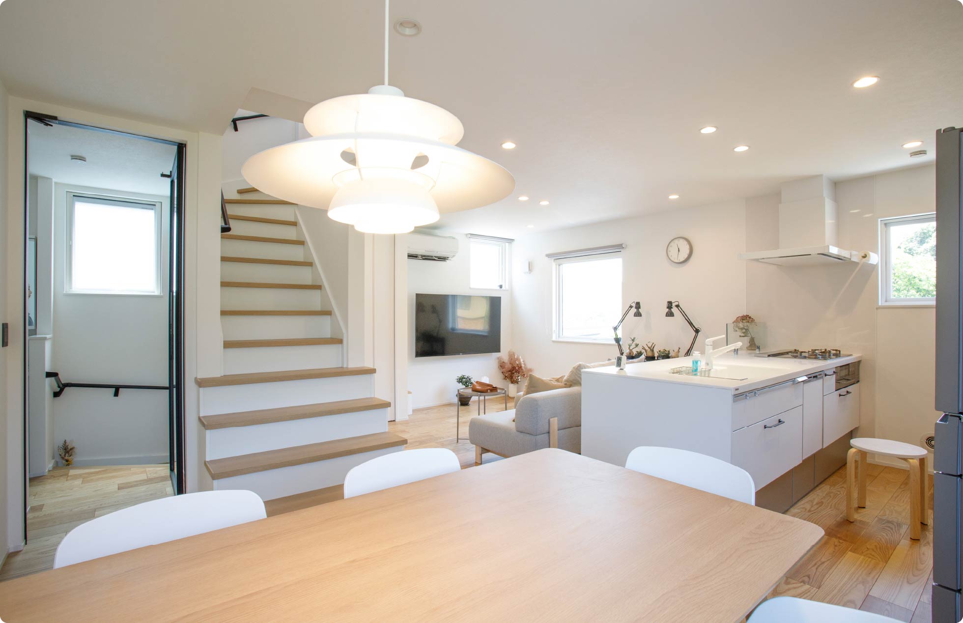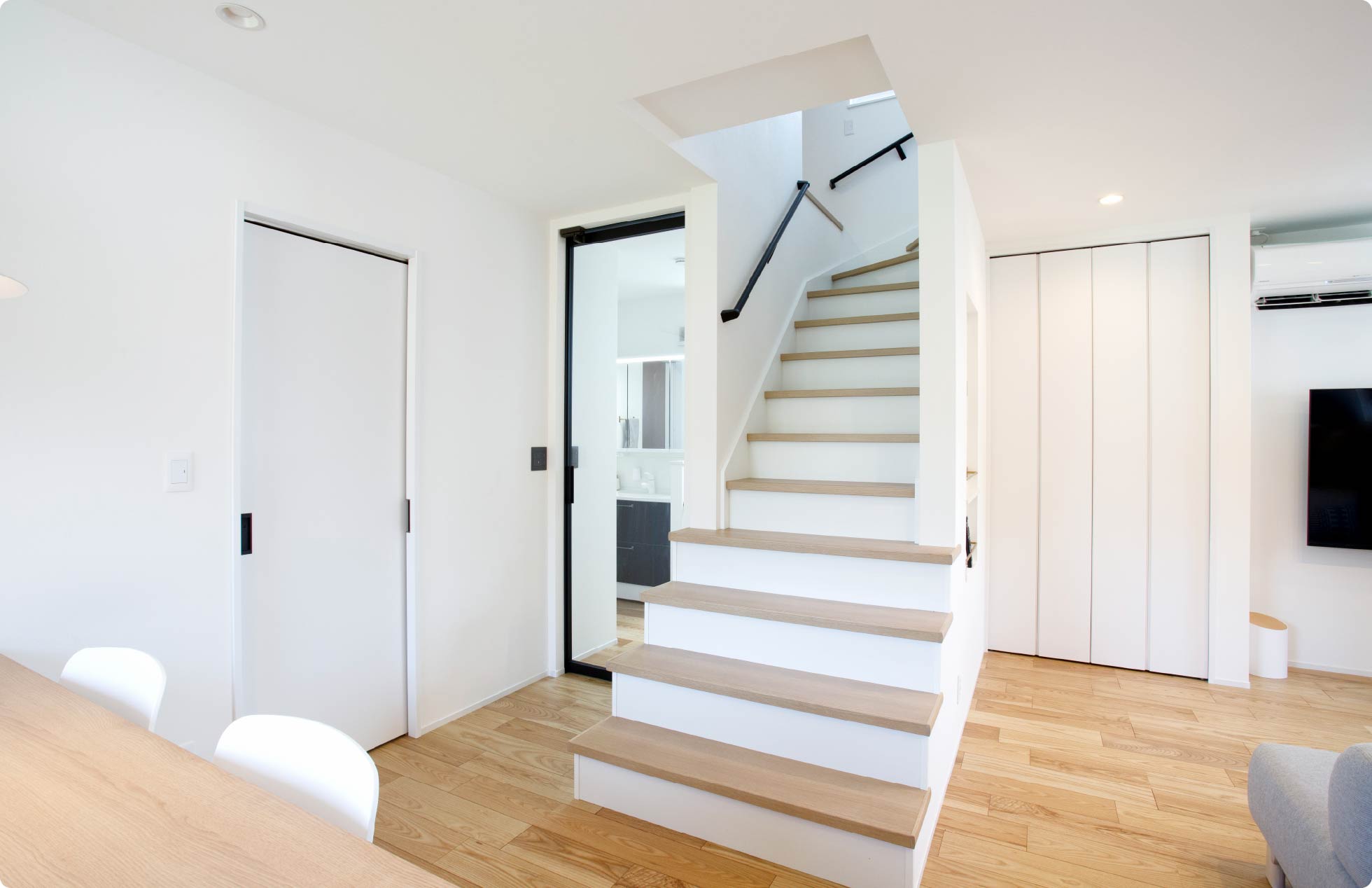 階段の下段の袖壁をなくしたことで、LDKがより広く感じられます。床の突板のフローリングに近い木目の踏み板と、白の蹴込板でより圧迫感のないコーディネートに