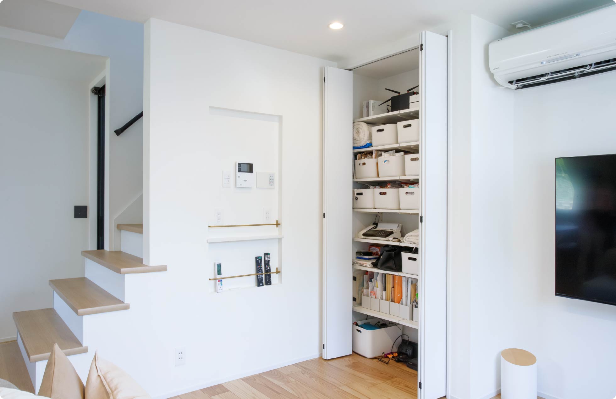 リビング収納の中にルーター、ブルーレイデッキ、FAX、ゲーム機などまで収納。壁裏の配線を通ってテレビとつながり、閉めてしまえばすっきり。壁にはリモコンとスマホ充電用のニッチを造作しました