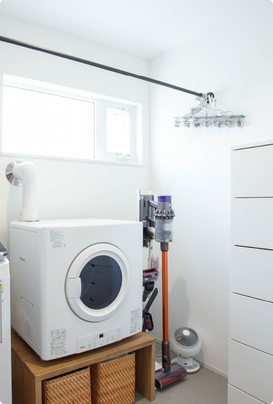 洗濯・脱衣室には室内干し用のポールと、ガス乾燥機乾太くんを設置。乾燥機にかけられない衣類だけハンガーに干して、乾いた衣類はチェストに収納