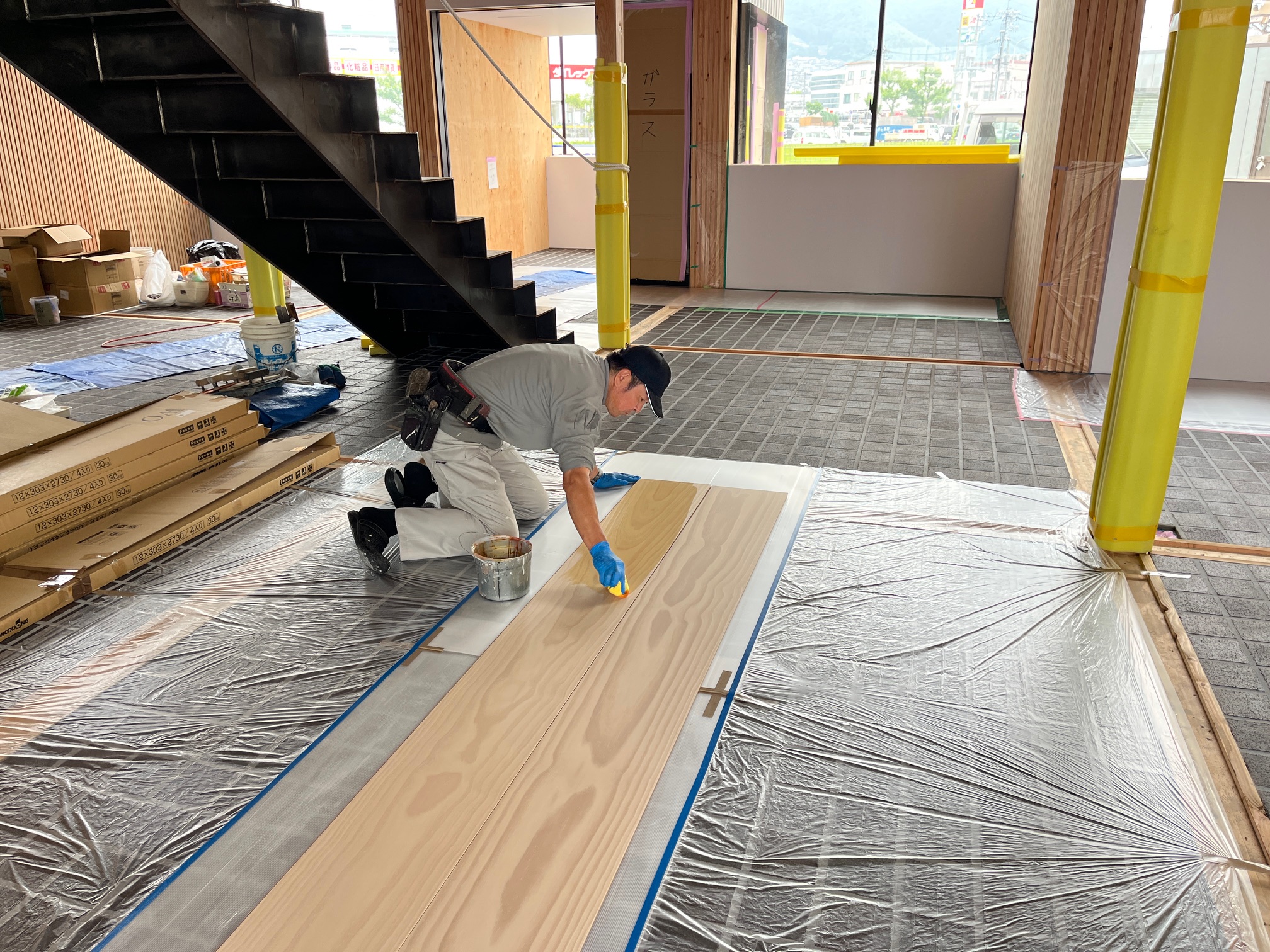 次の写真は、1階ホールの柱間に取り付ける敷居材に塗装を施している様子です。柱の色に合わせて丁寧に色を調整しています。この材料は、某建材メーカーの長尺(2,730mm)で、床暖房や土足にも対応した幅広フローリング材です。この材を柱のサイズ(130mm幅)に合わせてカットし、敷居として使用する予定です。