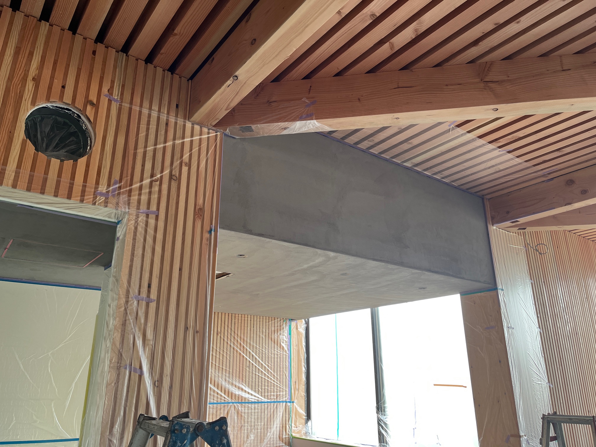 こちらの写真は、マーブルフィールの下塗りが完了した状態です。左官工事といっても薄塗りで、仕上げ塗りと合わせても厚さはわずか1mm程度です。細かい骨材を含んだ仕上げ材をコテで塗ると、美しい櫛引状(くしびきじょう)のラインが現れます。