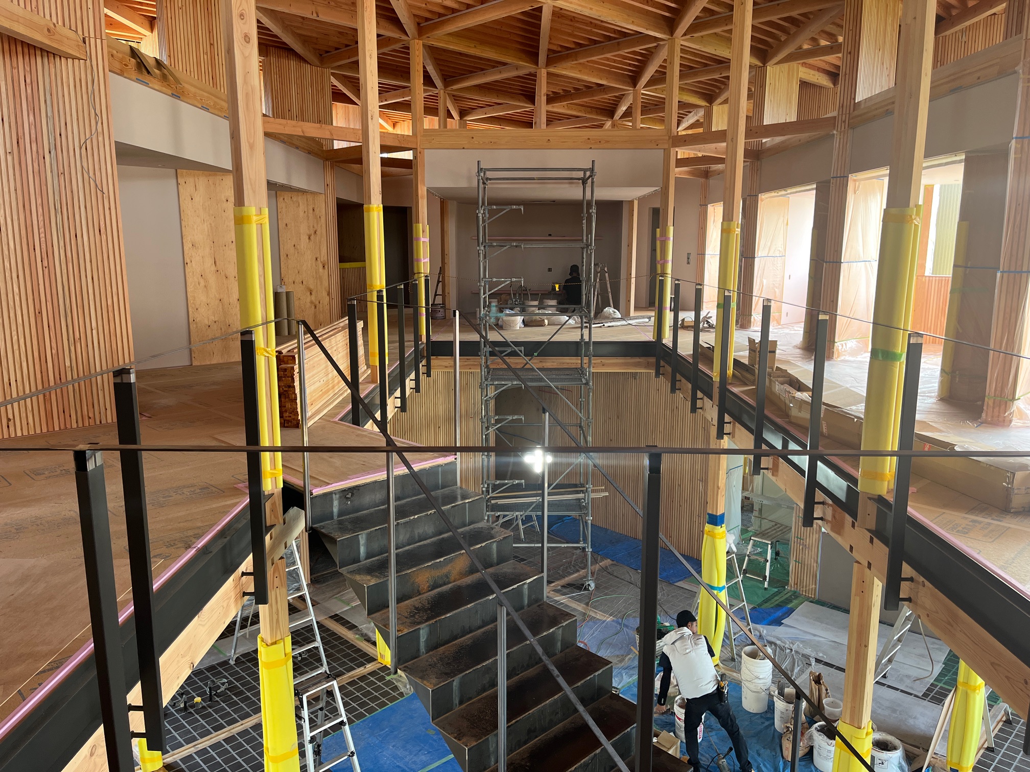 木造の梁にM10mmのボルトを貫通させ、背面からナットで締め付けています。非常に強固に取り付けることができました。鉄骨柱の天端には、木製手すりを取り付けられるよう、6mmのフラットバーを溶接で繋いでもらいました。現場での溶接作業だったため、火花が出ない特殊な溶接機械を使用して作業が行われていました。