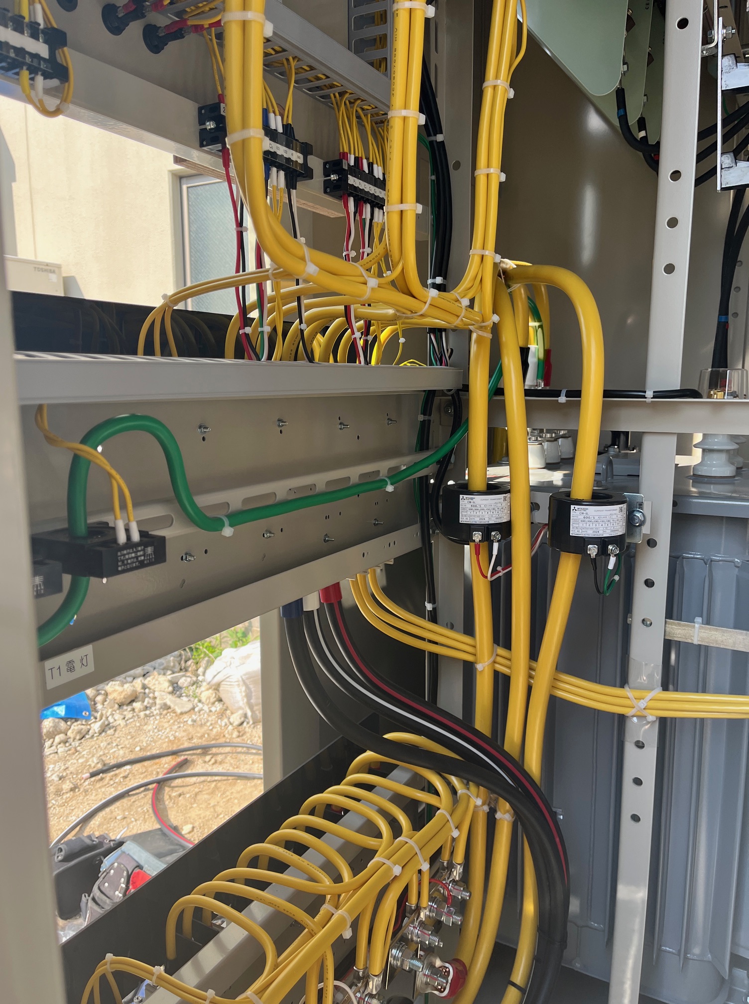これは、キュービクル(受変電設備)の内部配線です。整然と束ねられた配線は、私にとって非常に心惹かれるポイントです。