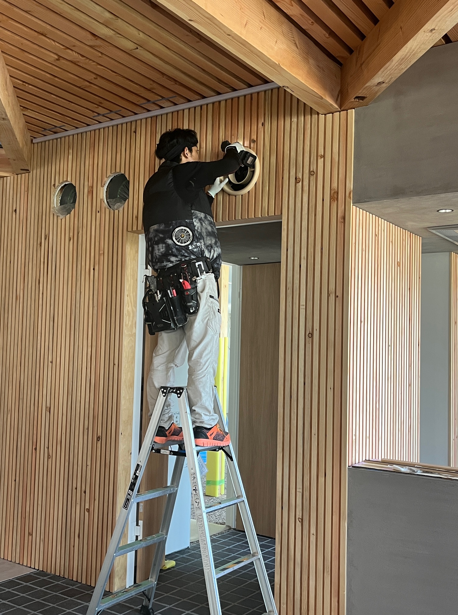 こちらの写真は、空調吹き出し口の取付の様子です。吹き出し口の色は、壁の木目の色に合わせて塗装しています。