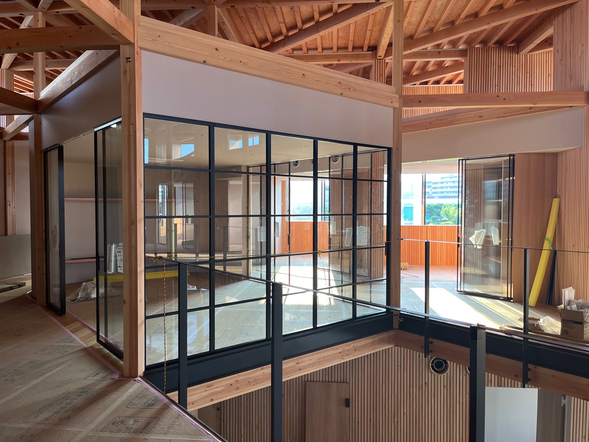 本日、キッズルームの嵌め殺し建具の取付が完了しました。使用したのは、パナソニックの「しきり窓」という商品です。カタログでは3連窓までの記載しかありませんが、調べてみると技術的には無限に連窓が可能なことがわかり、今回の採用に至りました。