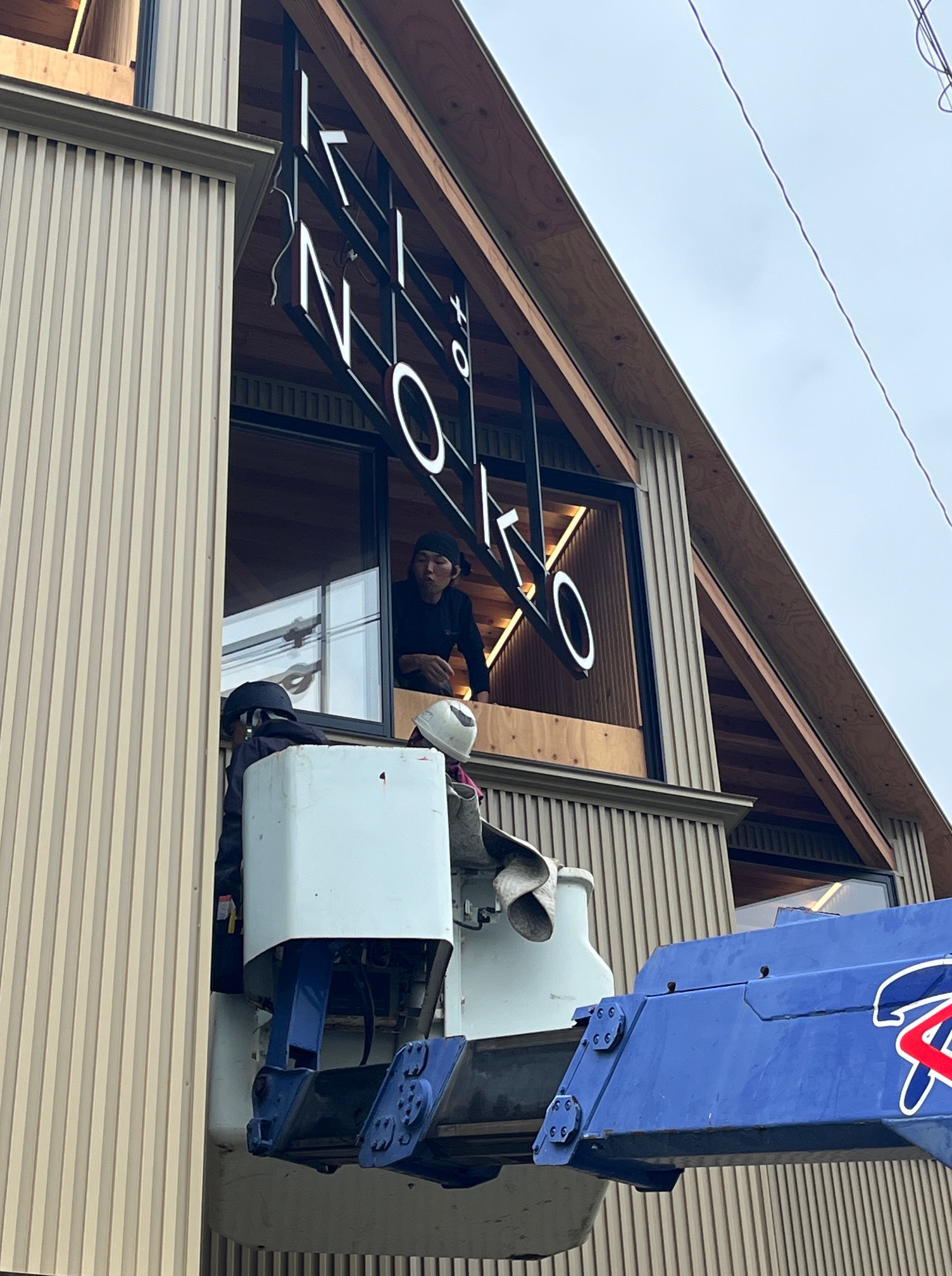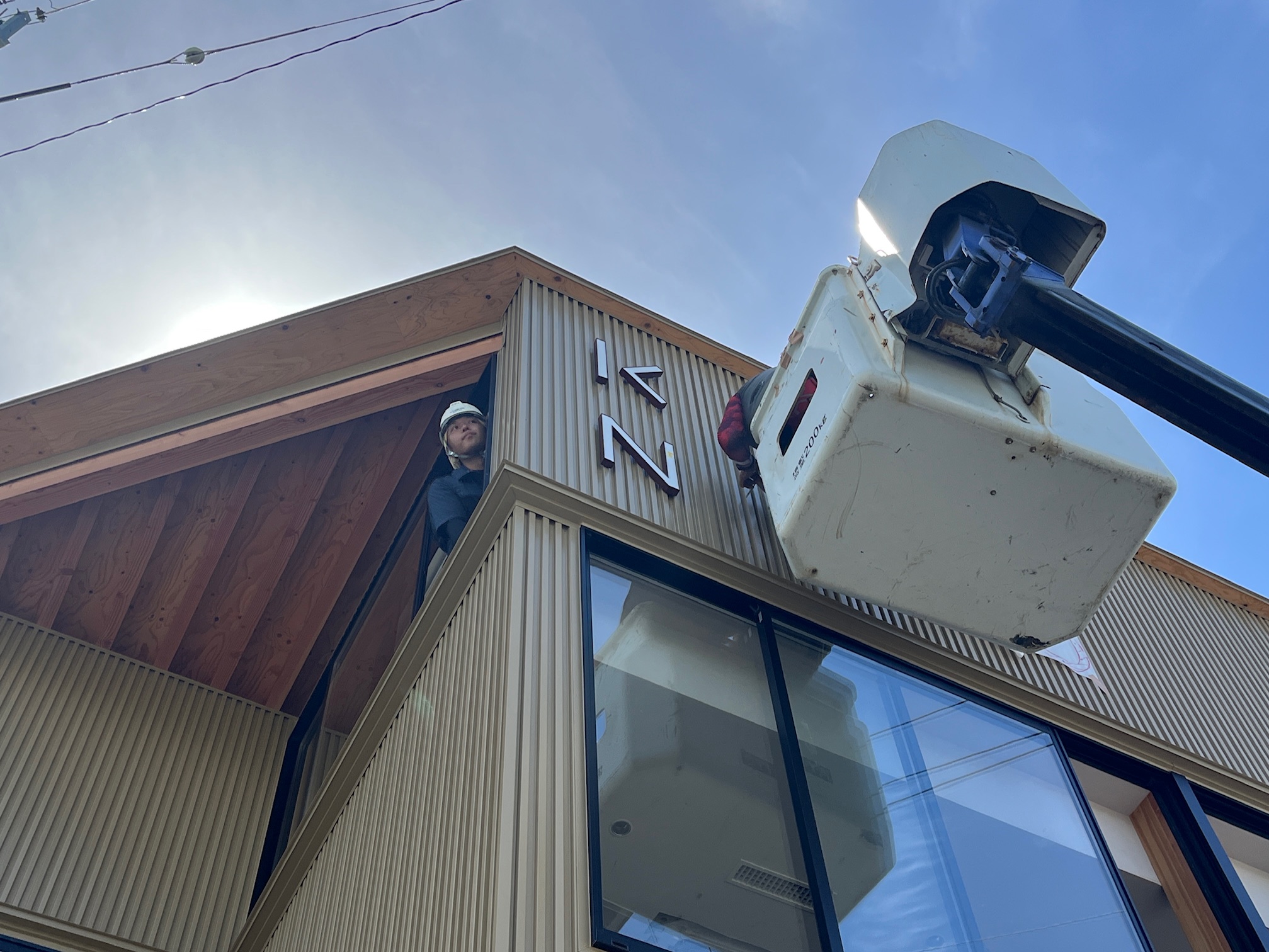 本日より2日間にわたり、外部看板の取付工事を行います。高所作業車をリースし、親方の激が飛ぶ中、職人の皆さんは手際よく作業を進めてくださいました(笑)。