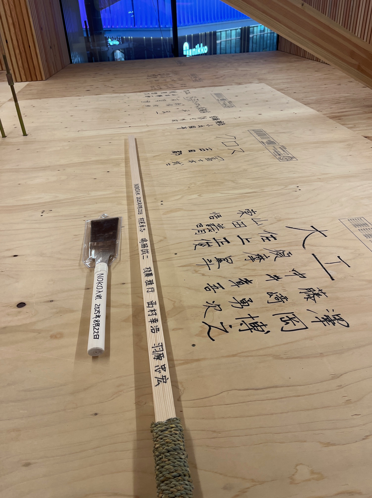 NOKO入れでカットした格子(木材)と鋸(のこぎり)は、欄間の階にある職人さんの署名入りの場所へ奉納させていただきました。