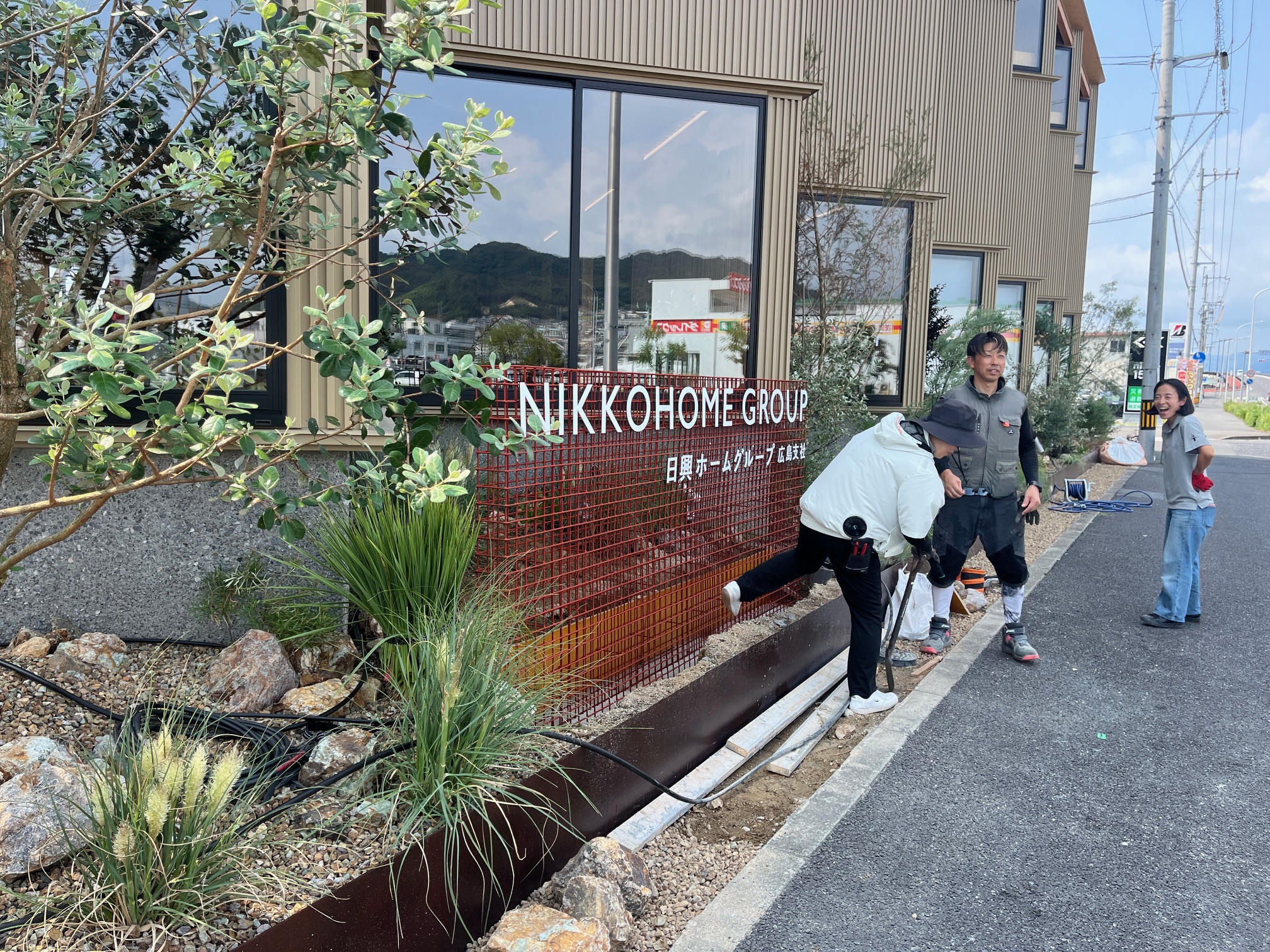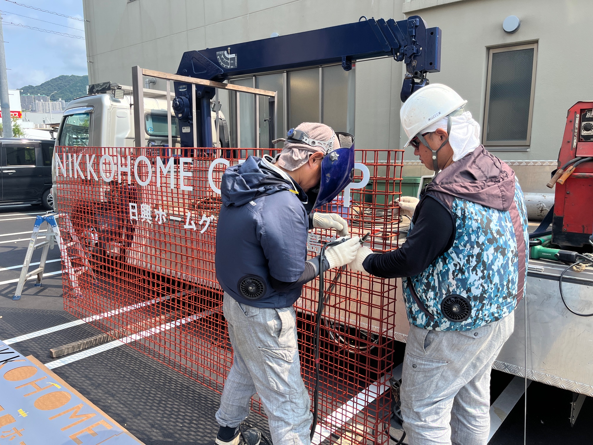 まず朝9時から、看板の取付作業がスタート。山口工業さんに外部看板の文字を溶接していただきました。
