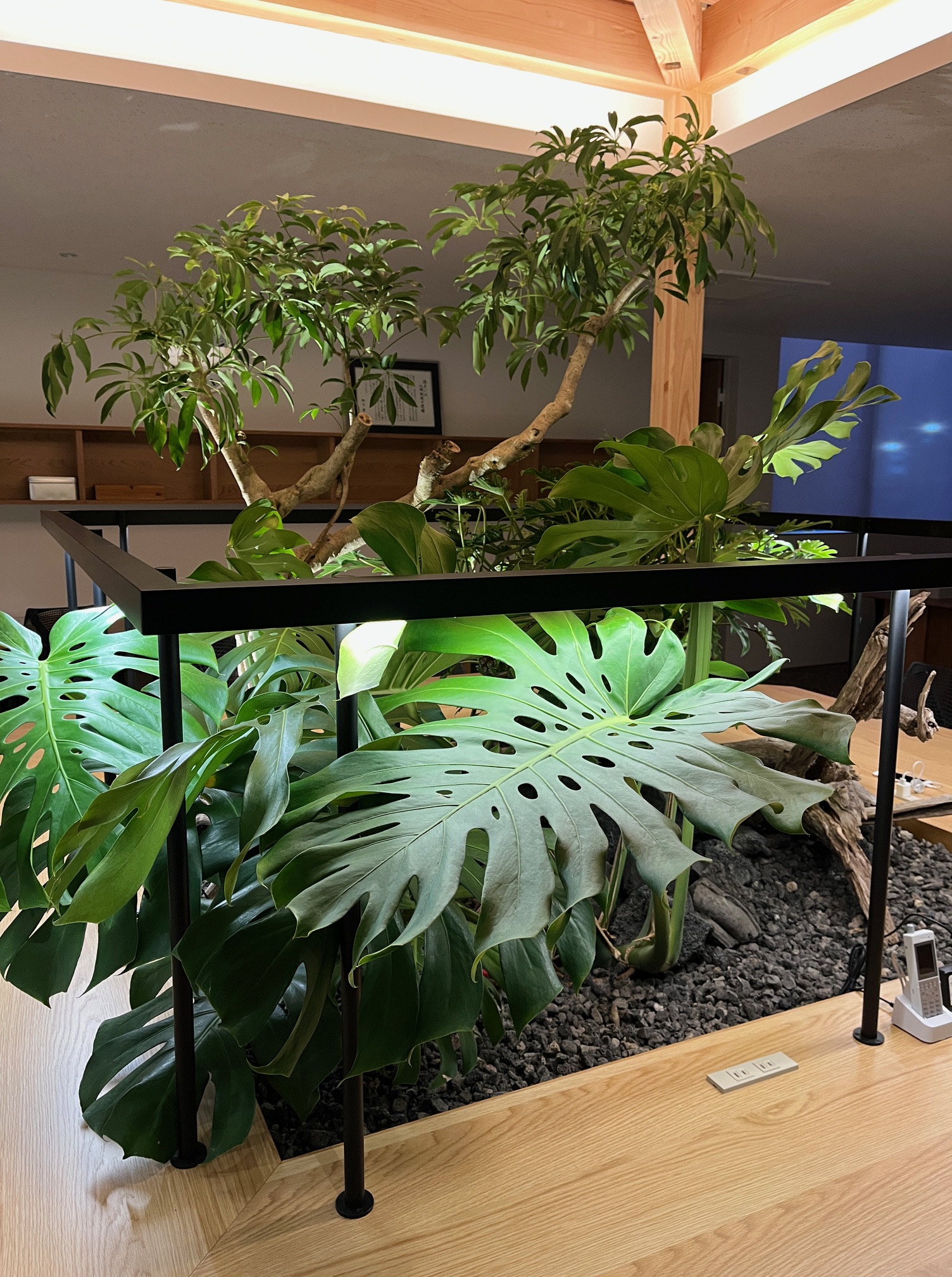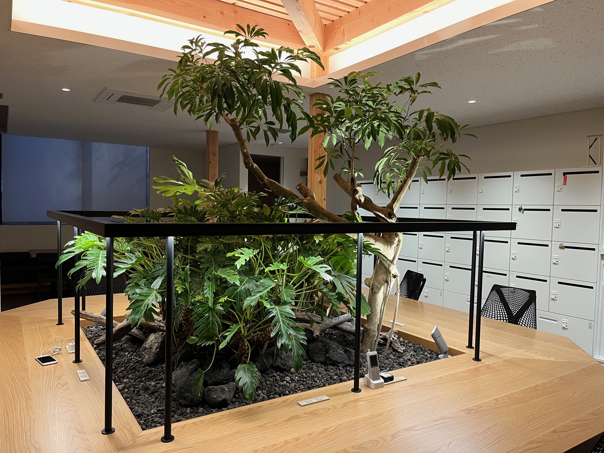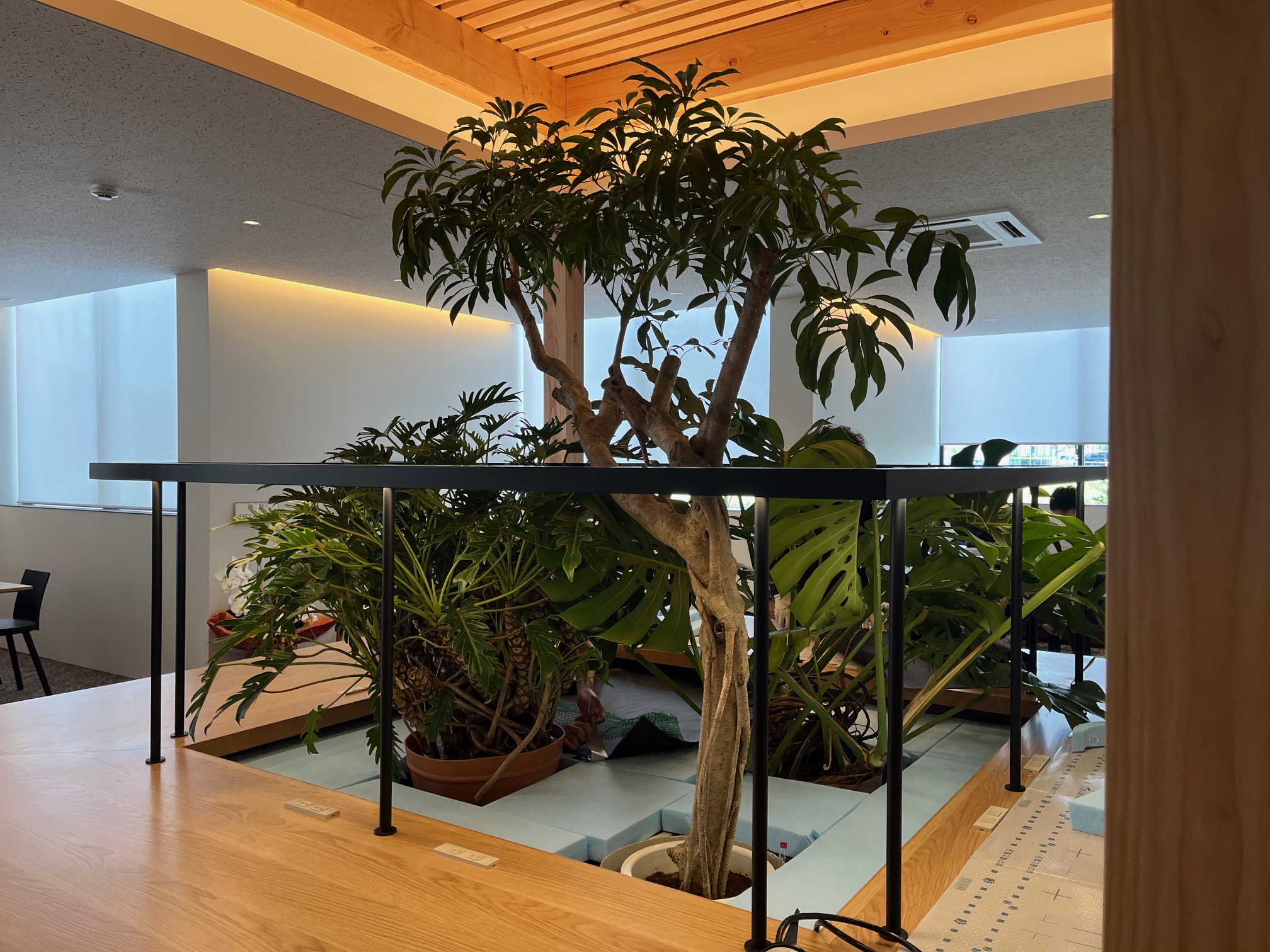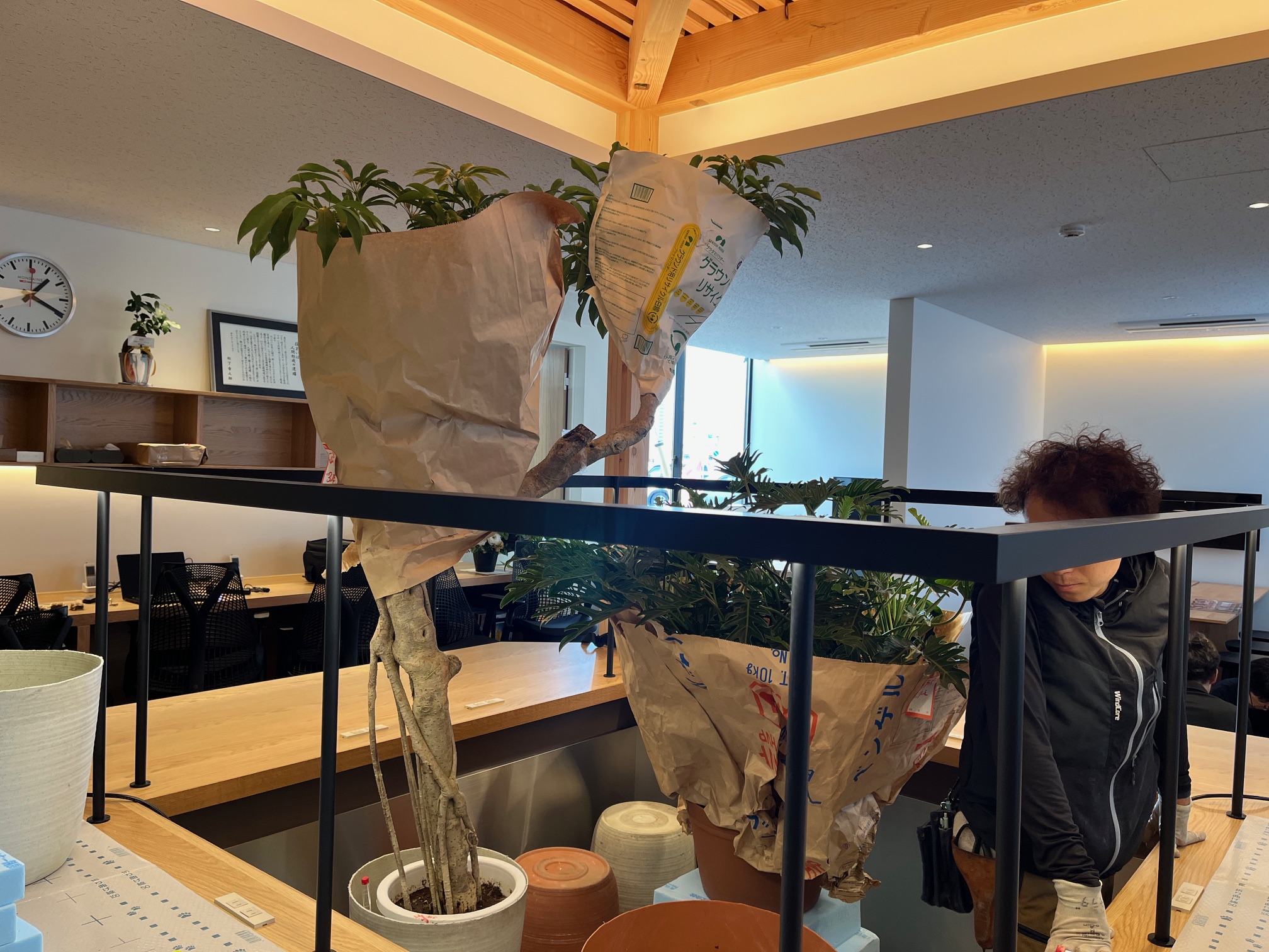 また、午後からはオフィスの植栽工事も始まりました。オフィス中央の「カフェ席」の中心部に、ジャングルのように植栽を配置していきます。
