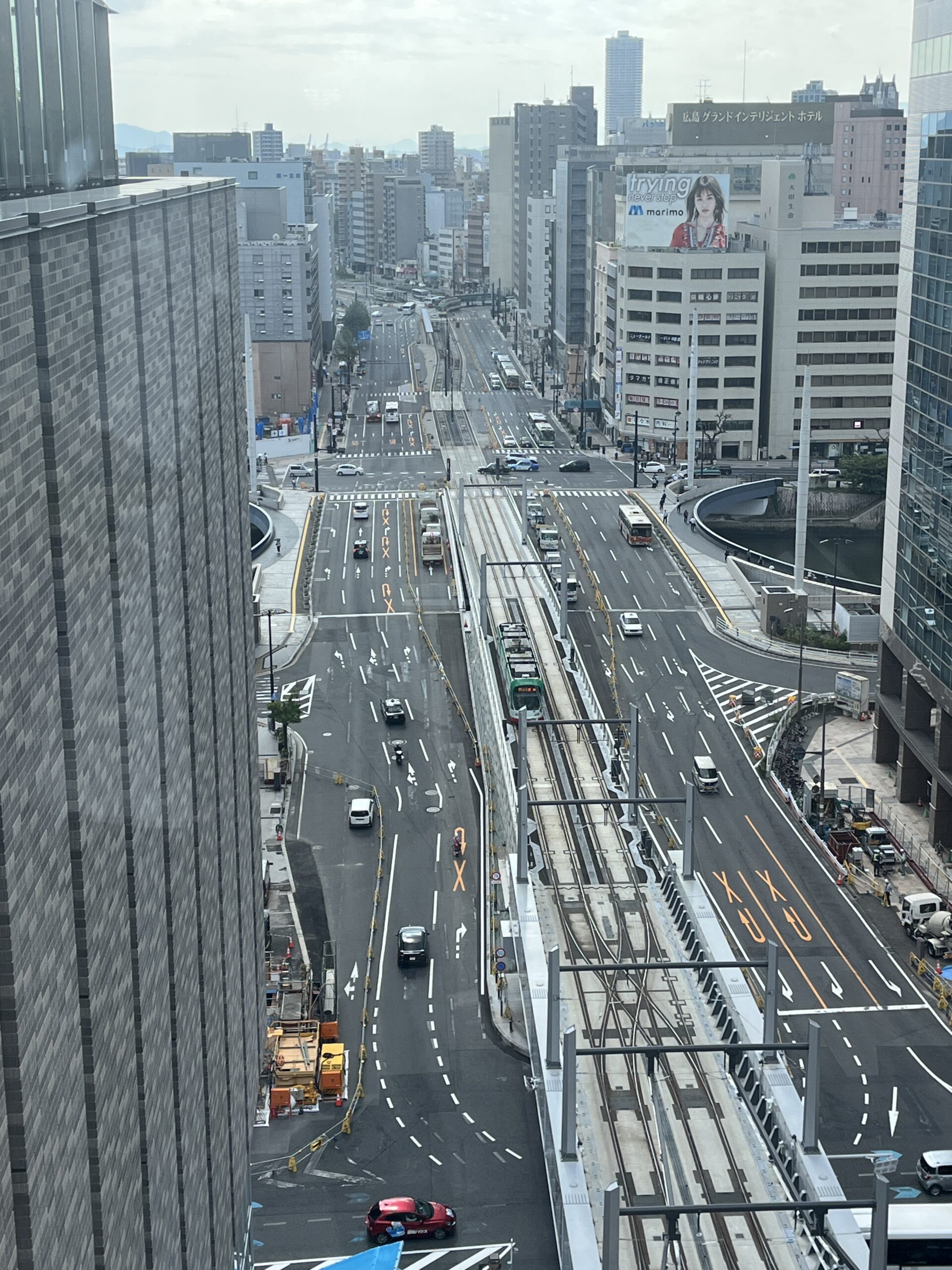 ガーデンの端にあるウッドデッキに立つと、下を走る路面電車が見えます。ガラス越しに見下ろす電車の姿は、どこか模型のようにも見えて、ちょっと特別な眺め。