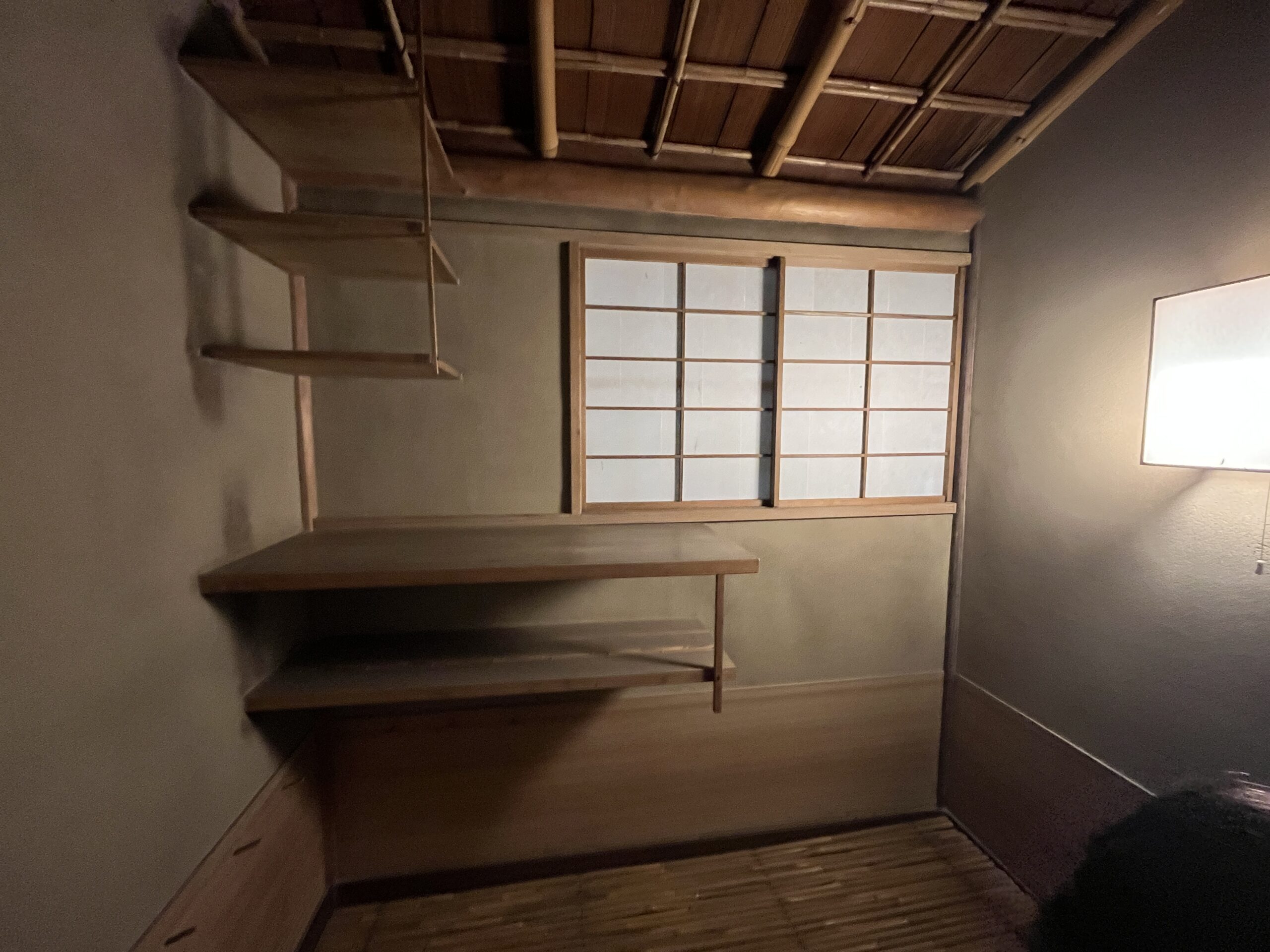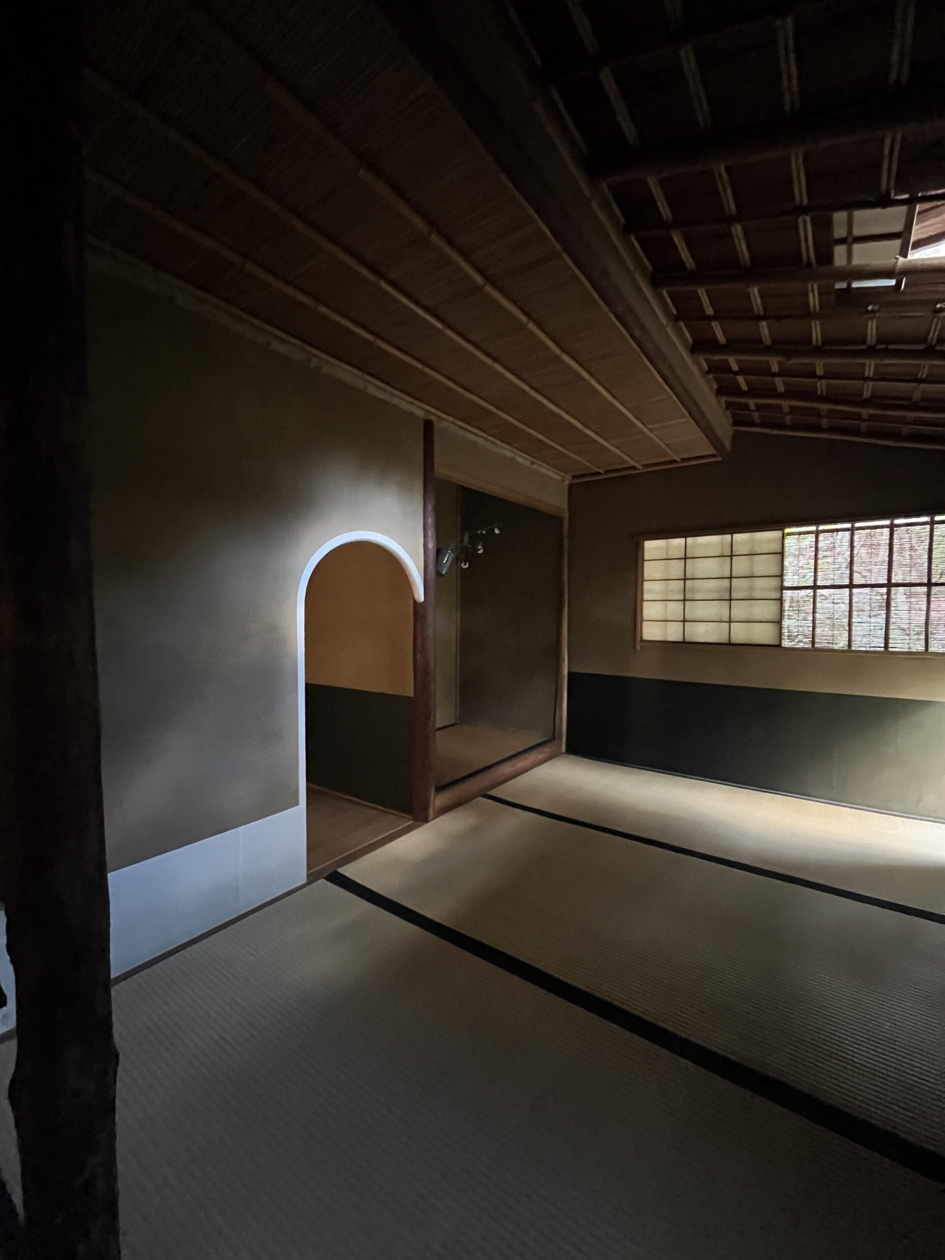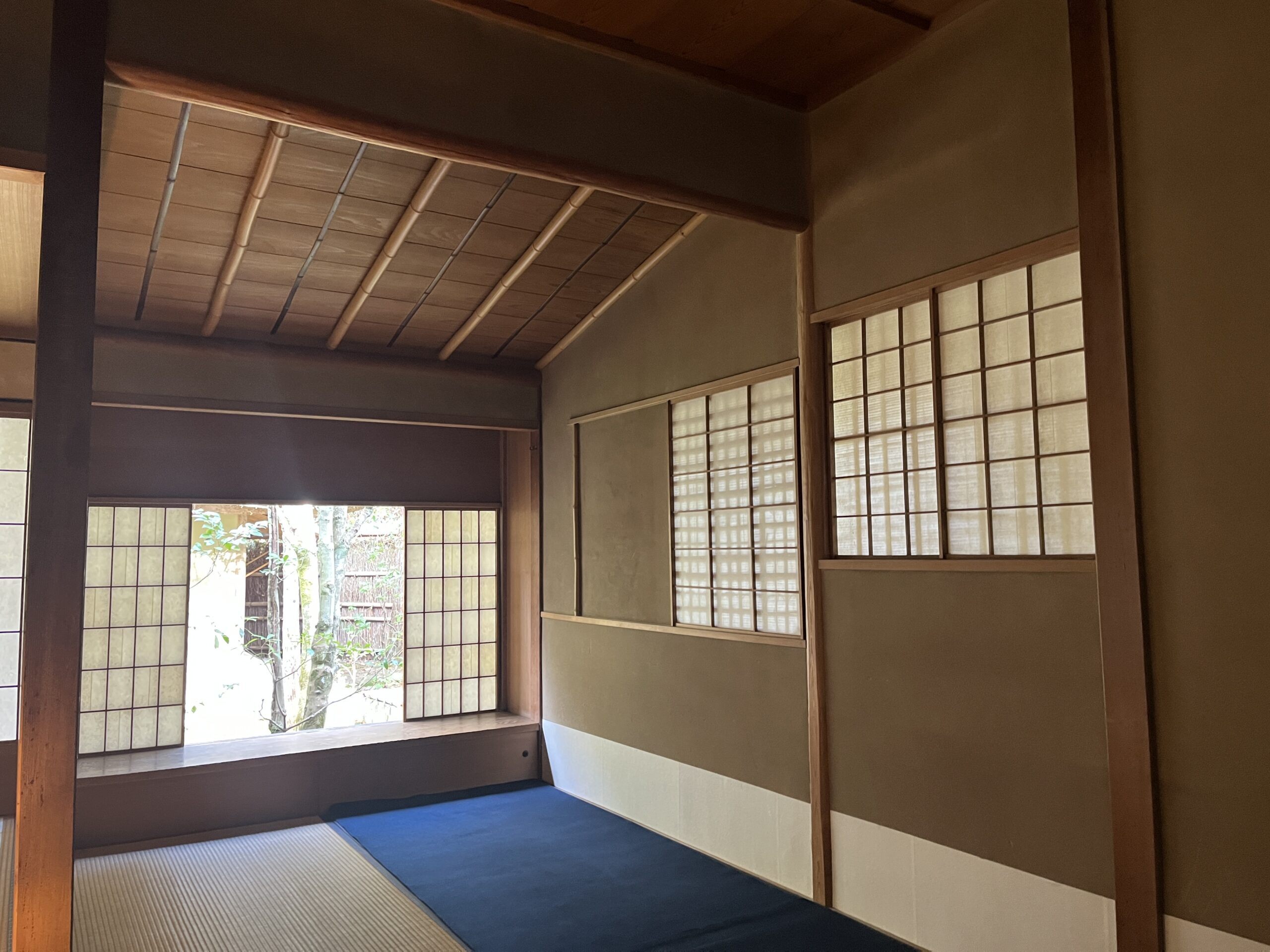 例えば、土壁の巾木部分は、和紙が貼られ着物の帯が汚れないようにされています。天窓が設けてあり程よい木漏れ日がさす工夫がなされていました。また、現代の建築でも多く採用されている、曲線の出入口なども当時からデザインされていたことに驚きました。