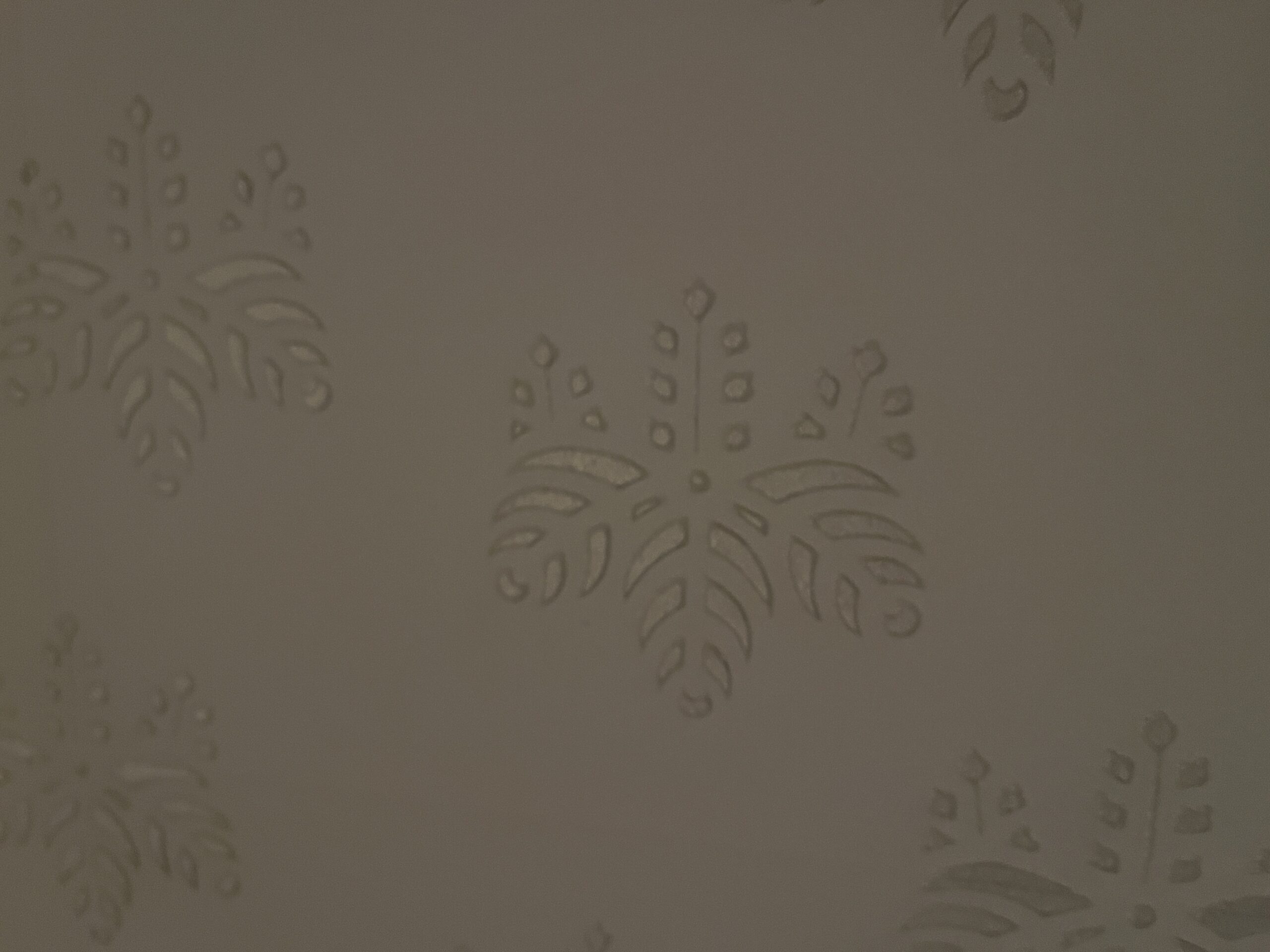 この写真は、九畳の間にある「ふすま」に貼られたふすま紙です。幾重に貼り重ねて紋章を作っているそうで、「五七桐(ごしちのきり)」の紋章です。