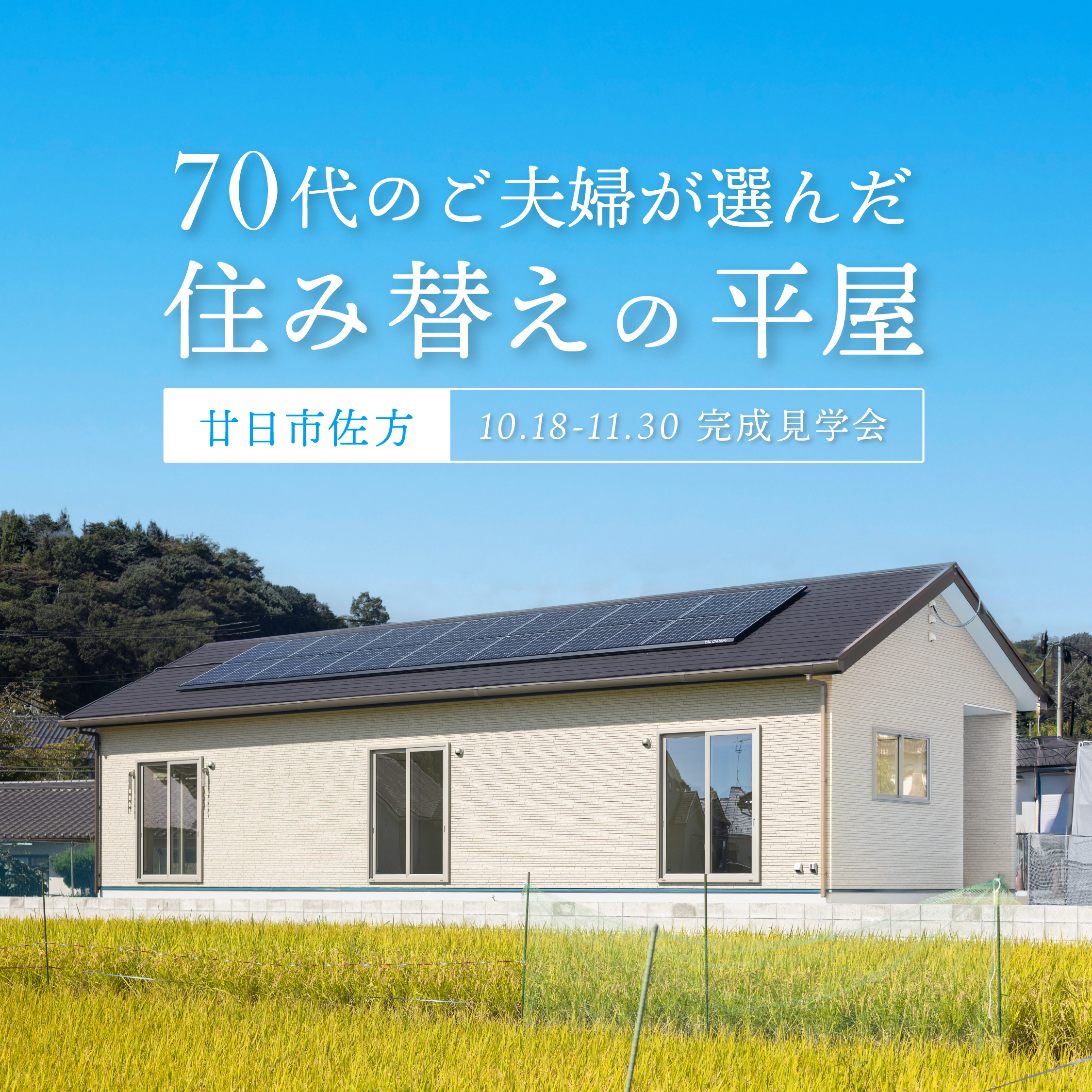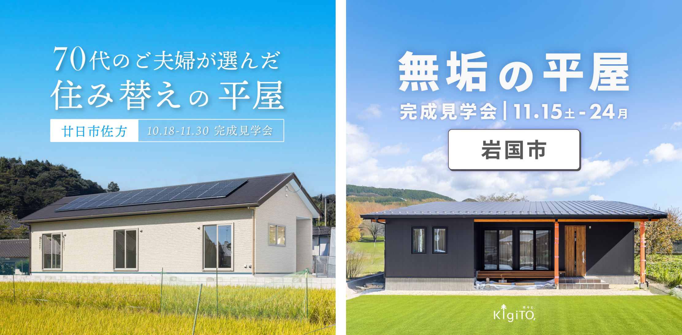 平屋のリアルな暮らし心地を体感できる完成見学会を、広島エリアで2棟同時開催します。