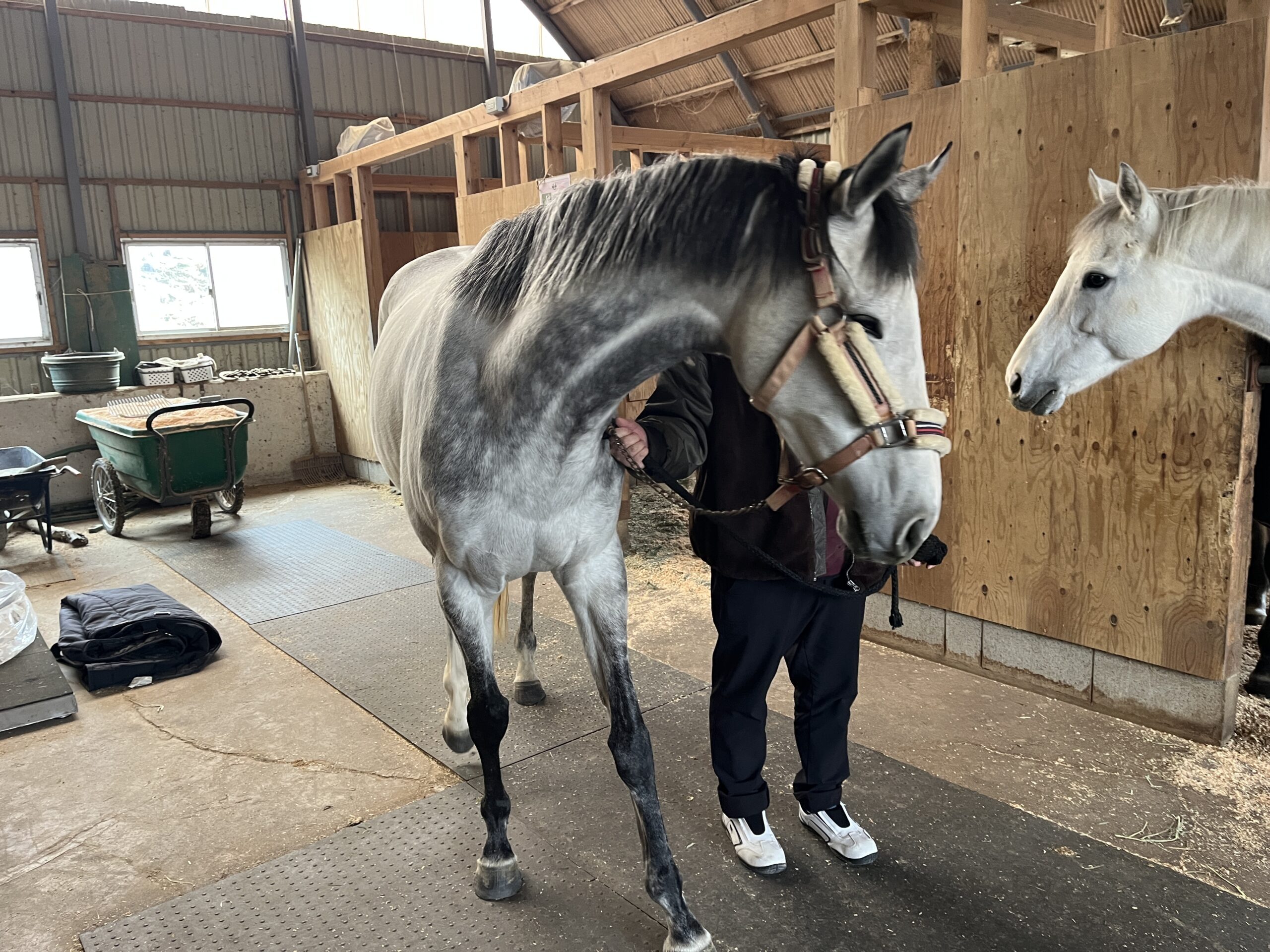 サラブレットが立ち、向きを変え、横になってもストレスを感じない十分な広さが確保されていました。数値だけで知る寸法と、実際に馬が中で動く様子を見るのとでは、理解度がまったく違います。