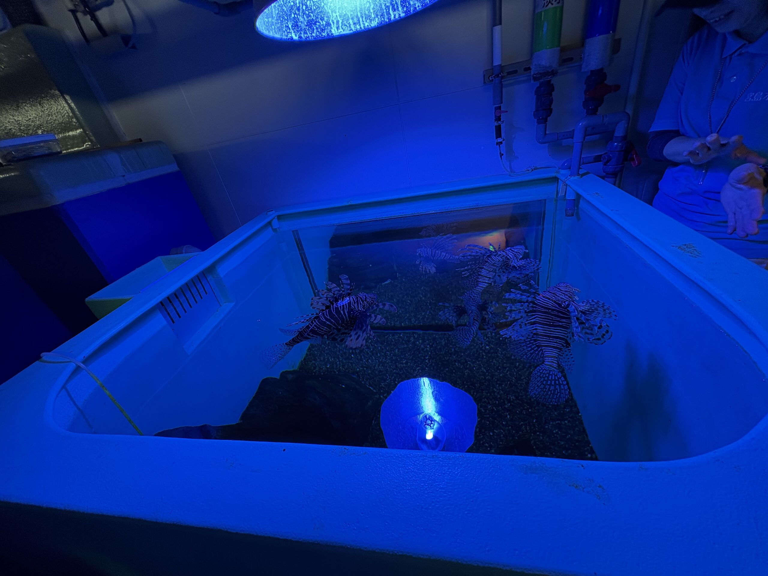 徹底的な温度管理のもと泳いでいる魚や、治療を受けている最中の魚もおり、