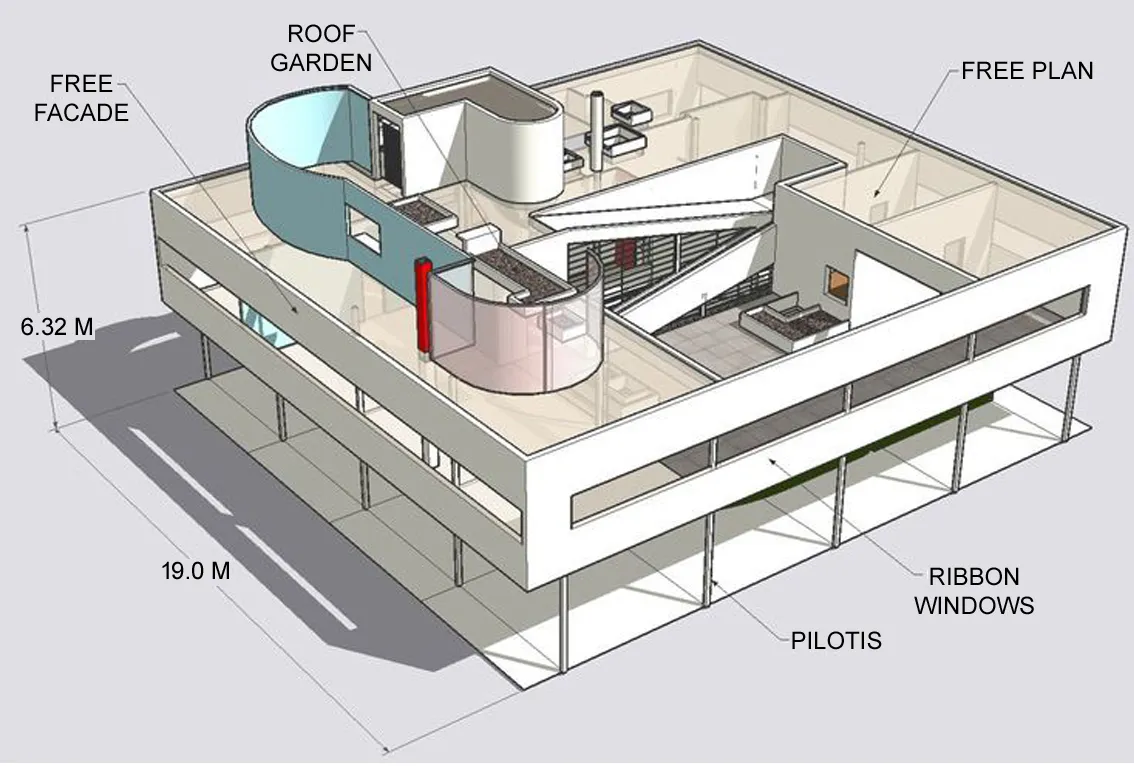 サヴォア邸が特に有名なのは、コルビュジエが提唱した 近代建築の五原則(Les cinq points de l’architecture moderne) をもっとも純粋な形で実現した建物だからです。