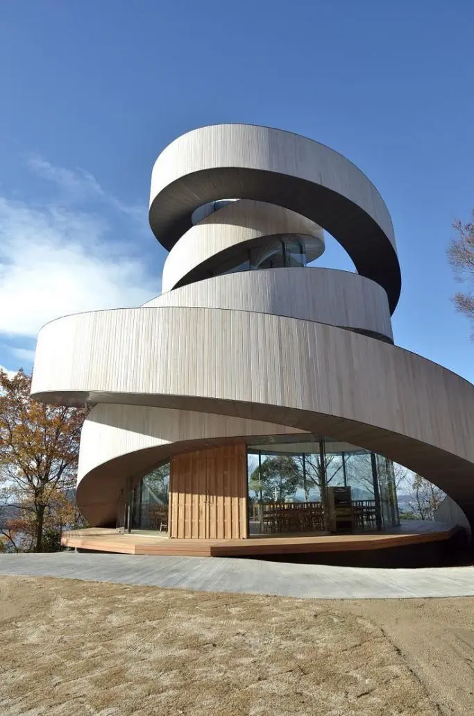 リボンチャペルはその代表作の一つで、2本の螺旋階段が絡み合い、頂上で一つに結ばれる構造が特徴です。