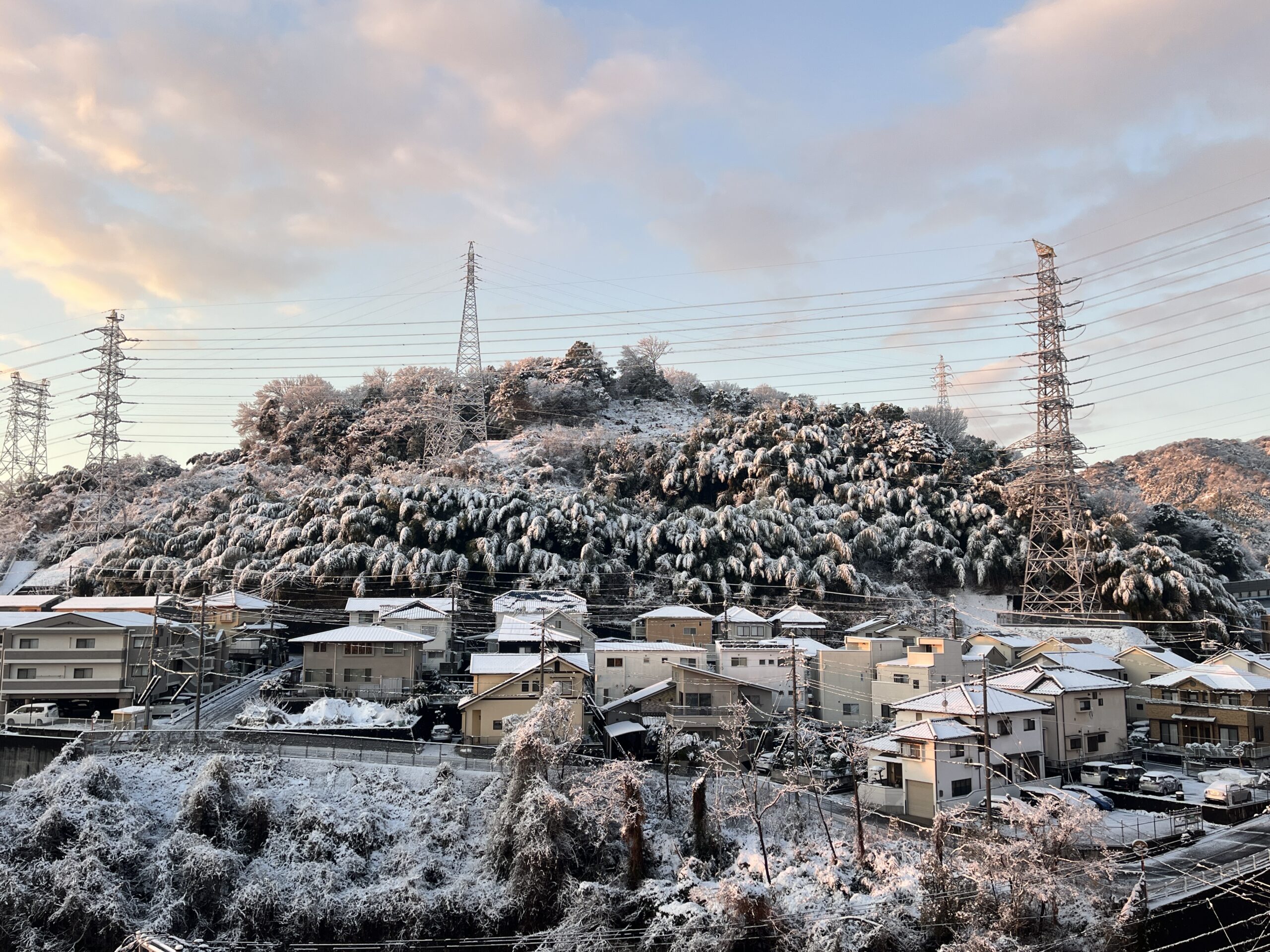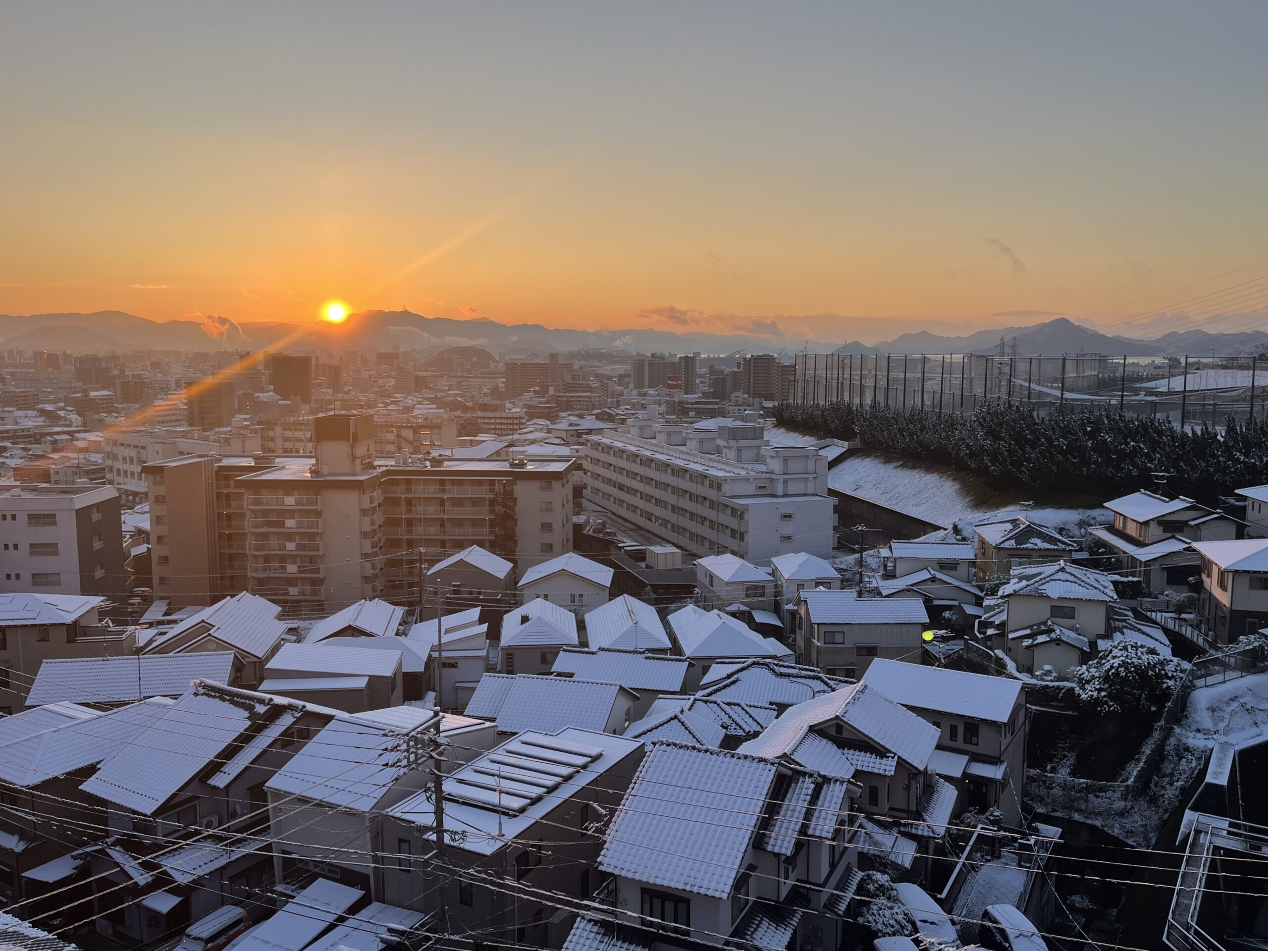 翌朝、カーテンを開けると、そこには久しぶりの雪化粧をした広島市内の風景が広がっていました。