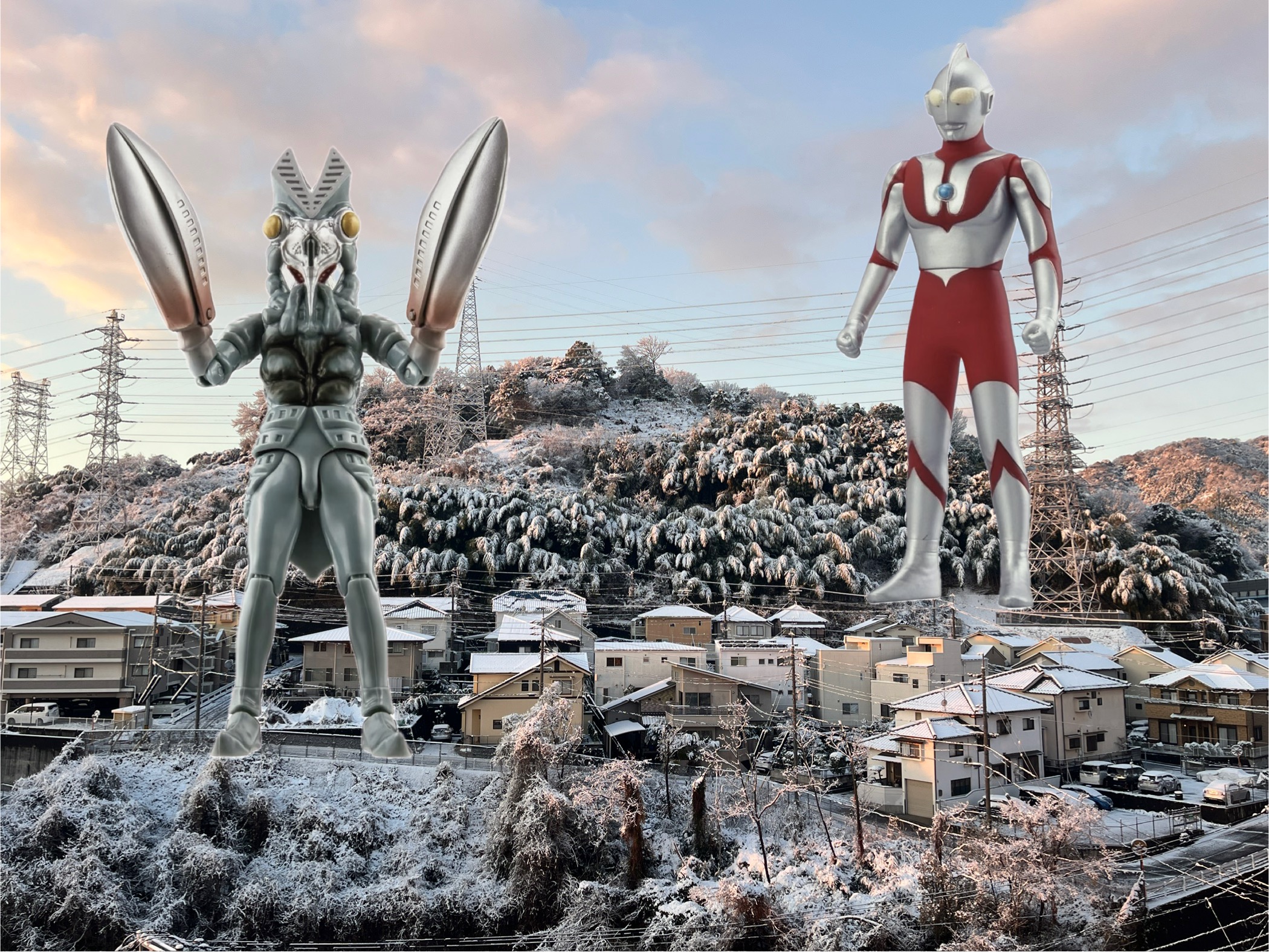 雪の街に突如現れたのは……バルタン星人(かなり古いですが)とウルトラマン!