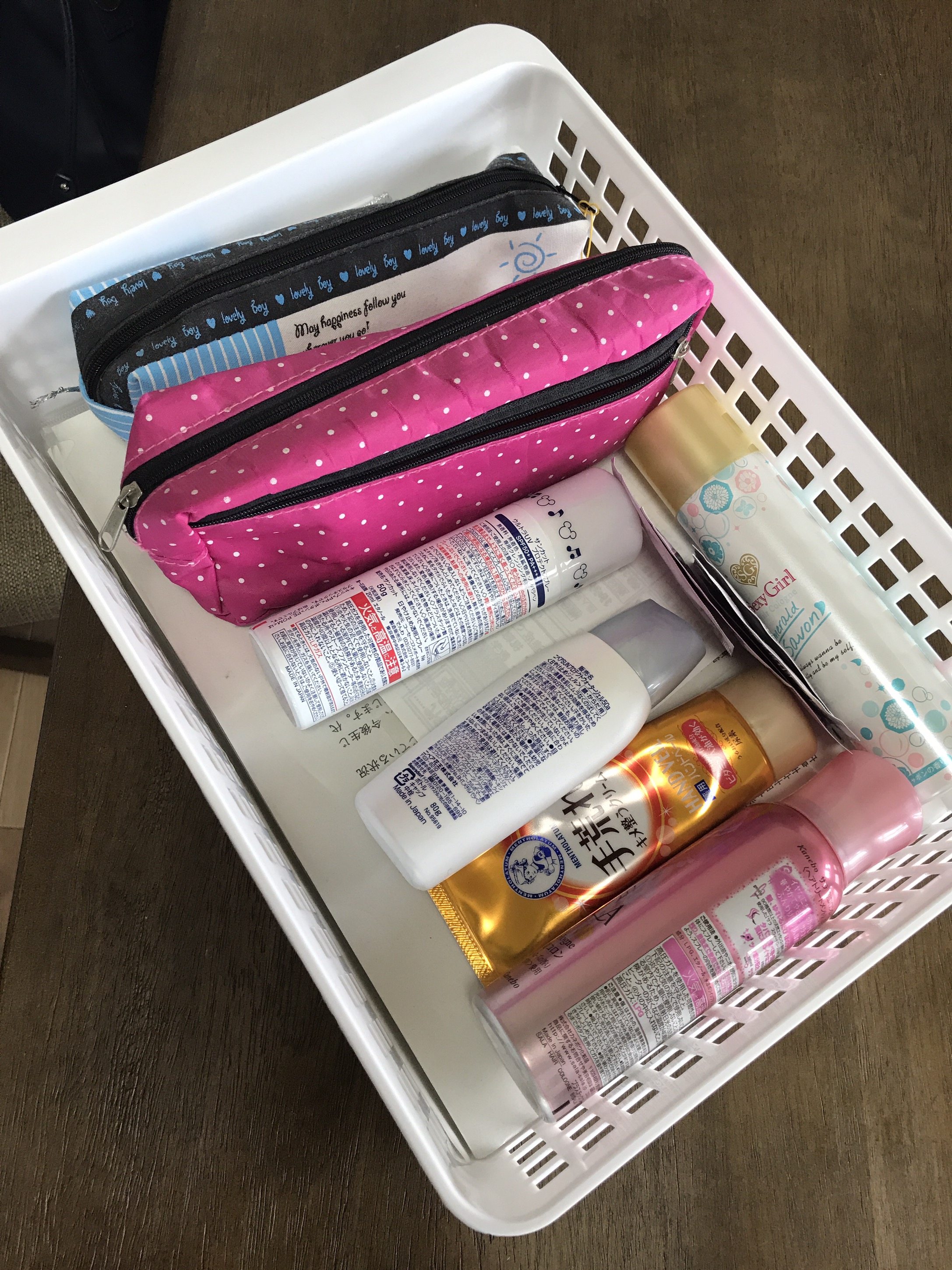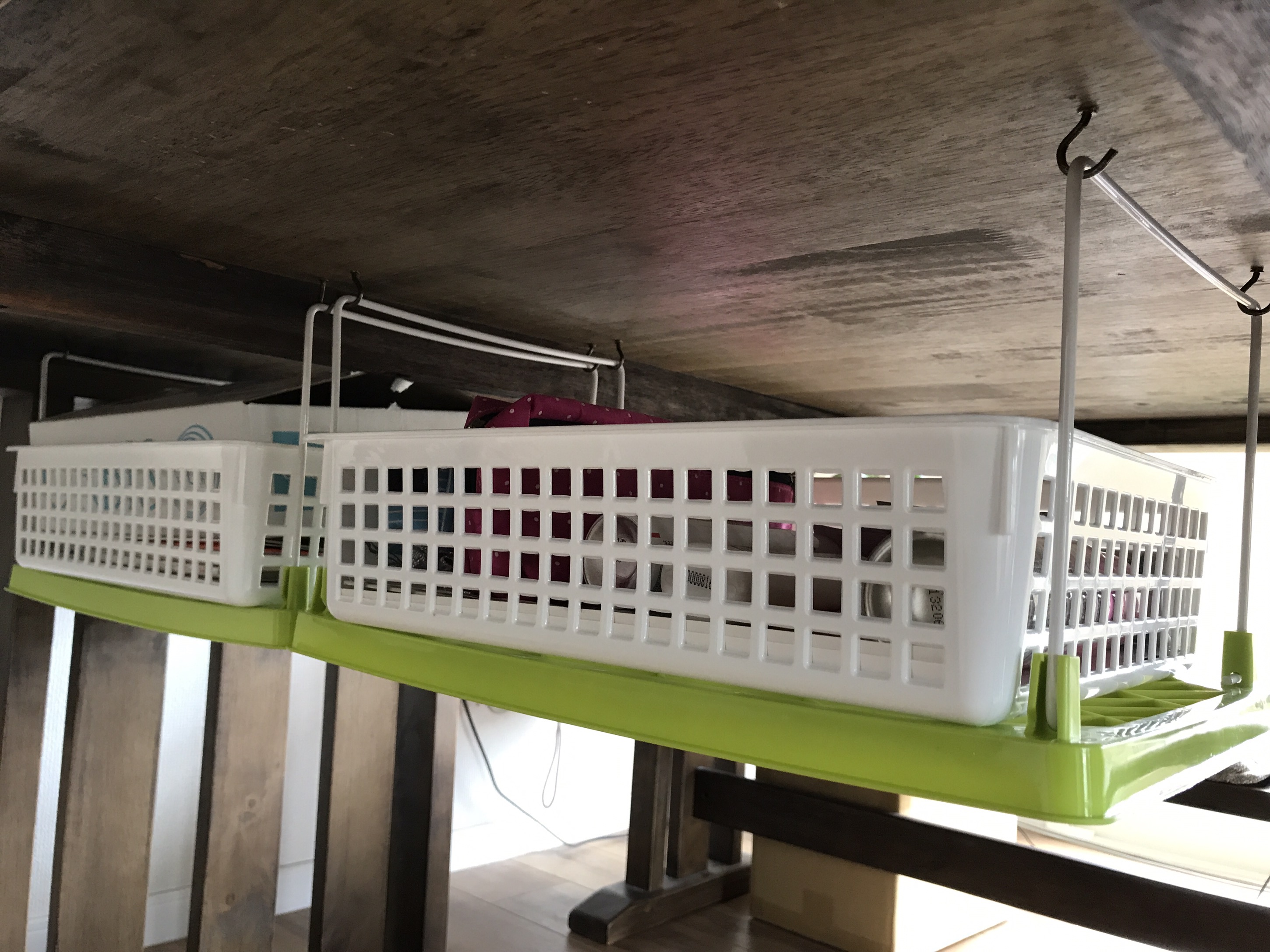 A4収納ケースに小物を入れて…? 机の下に鍵型フックを取り付けて、台所収納を逆さまに取り付けて、先程のA4収納ケースを引出しとして使います?