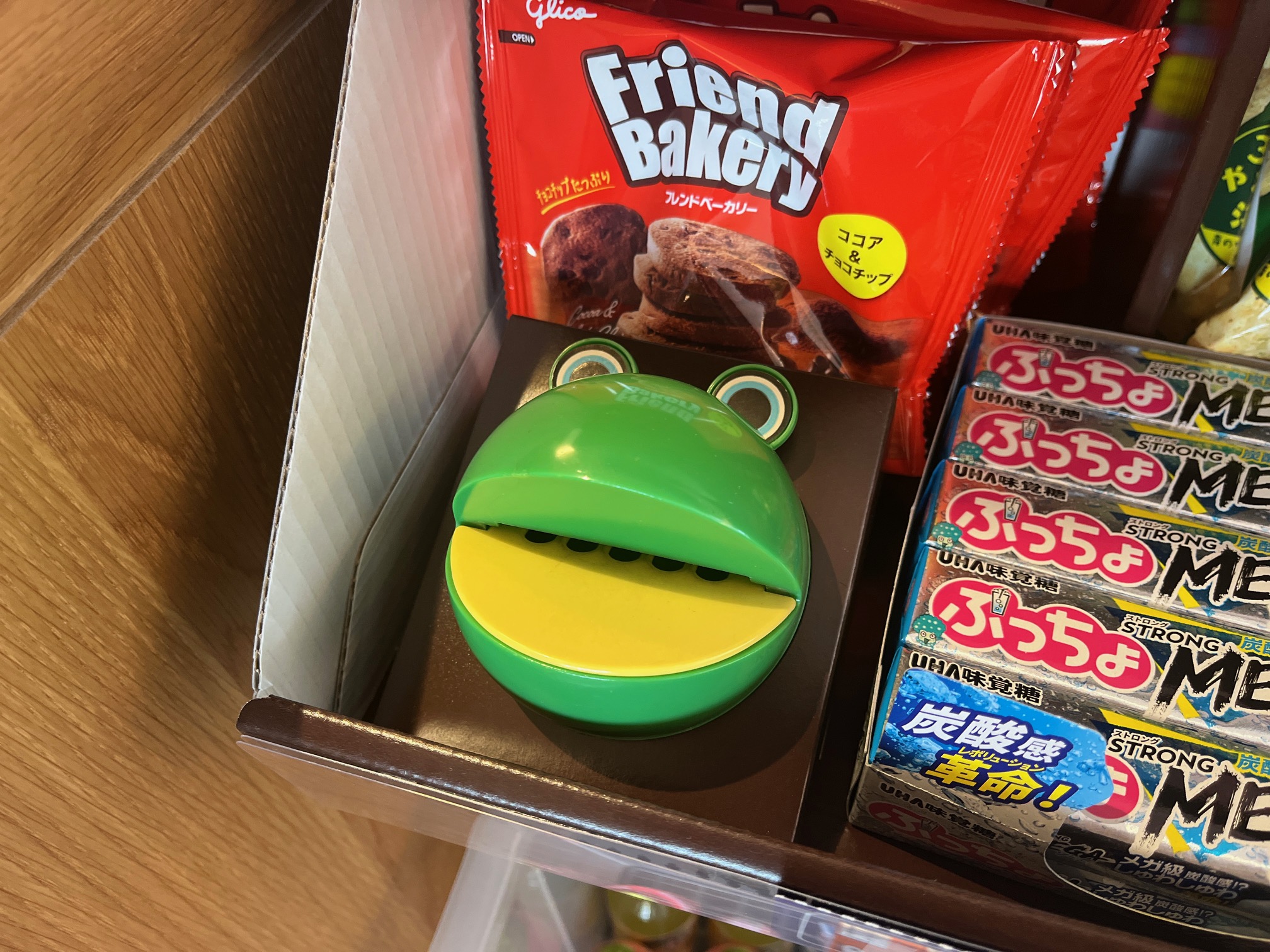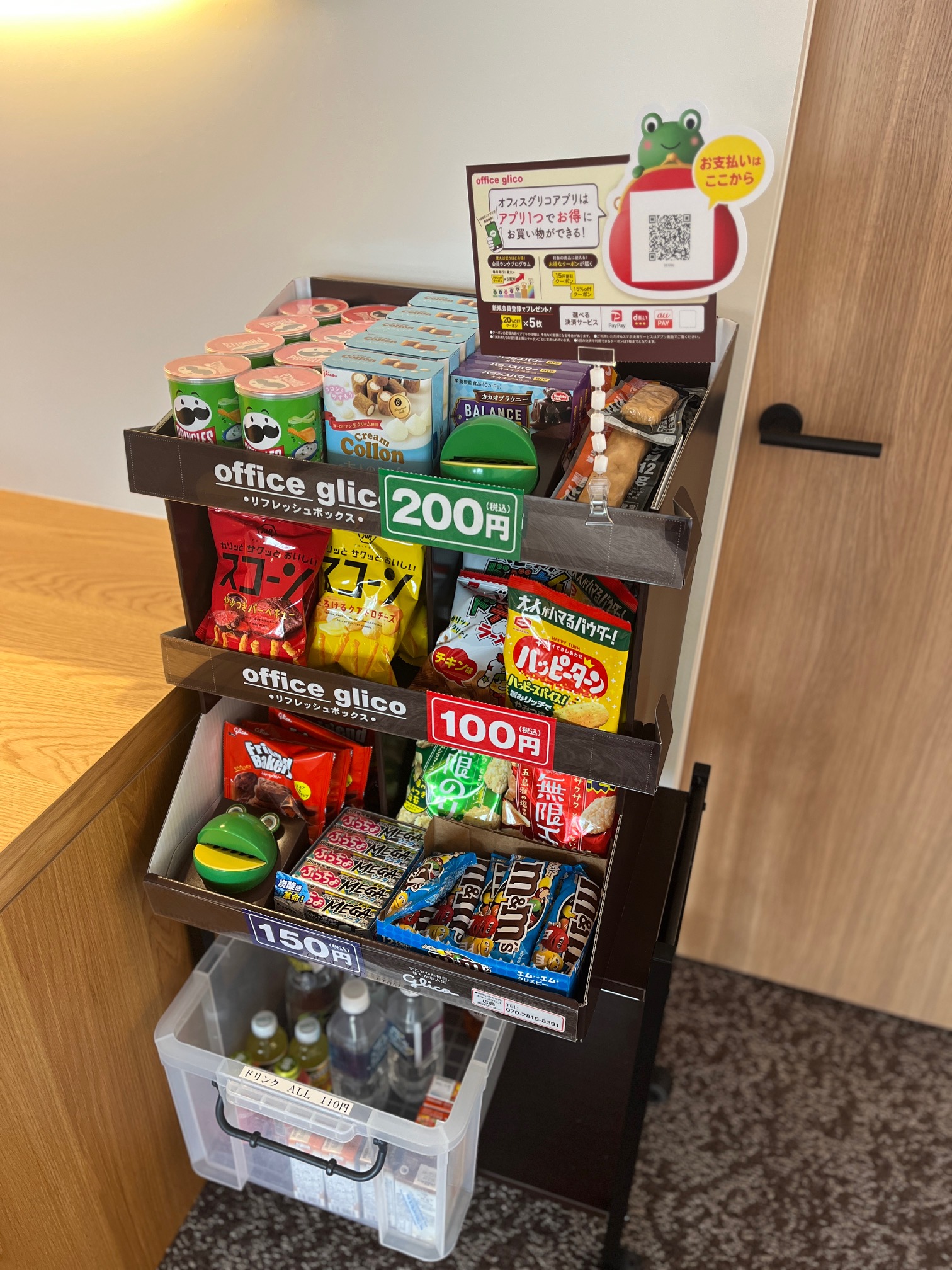 1つ100円~というシンプルな料金体系で、商品は1つ100円(または200円程度)で購入可能です。支払いは備え付けの集金箱(カエルの口)にお金を入れるか、キャッシュレスでの支払いも可能です。