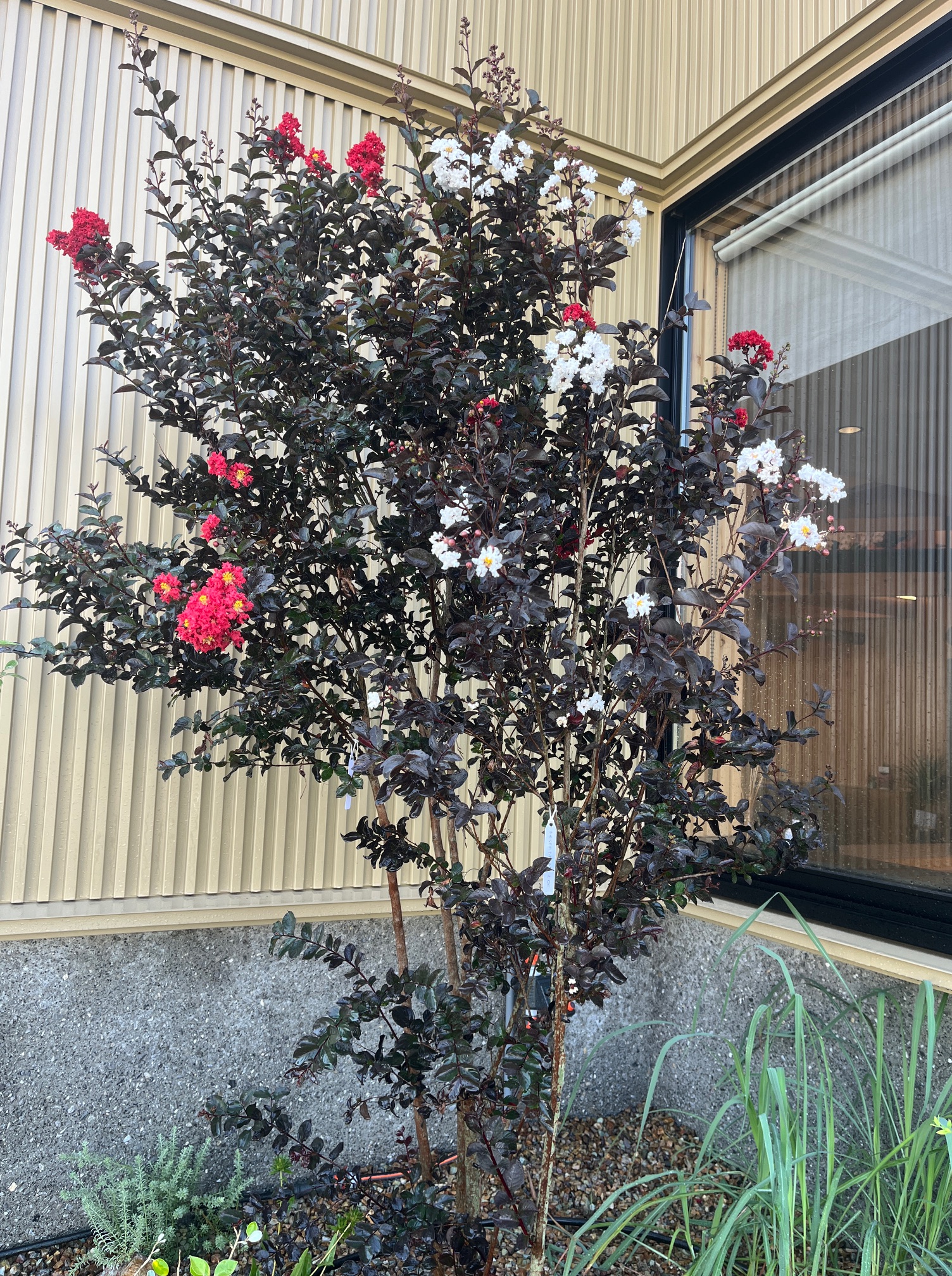 深みのある葉色と、鮮やかな花色のコントラストが美しいサルスベリ。夏の暑さの中でも元気に咲き誇り、庭を華やかにしてくれます。現在、紅白の鮮やかな花が咲いています。