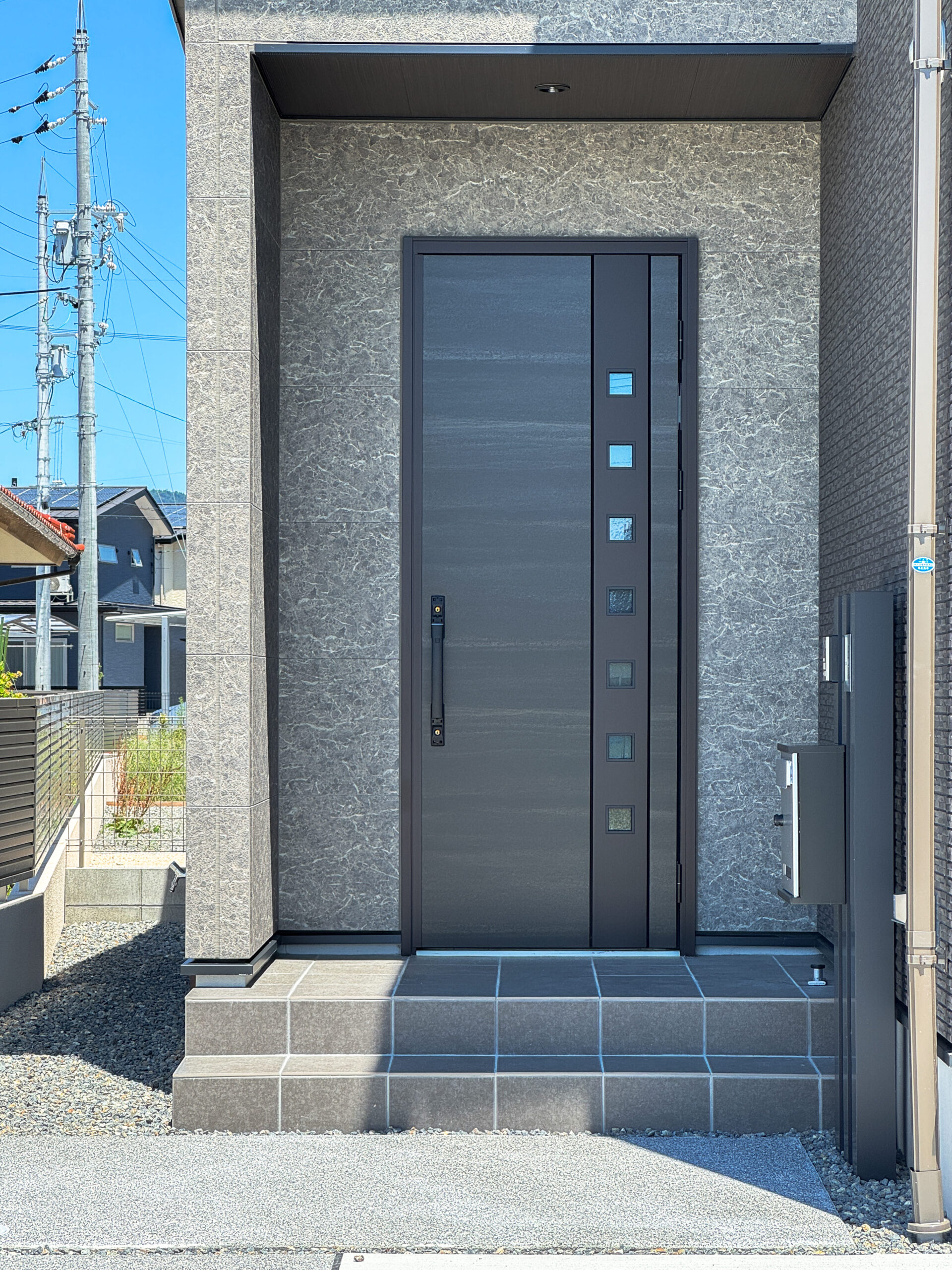 玄関周りには大理石をモチーフにしたアクセント外壁がベースの外壁のブラウンを引き立たせています。