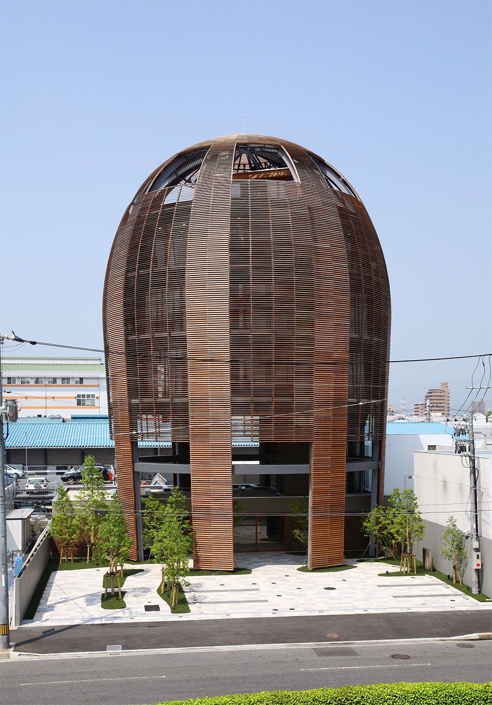 Wood Egg は外観が卵形(Egg)で非常に印象的。木製ルーバーで包まれた外観は日射を遮る設計になっており、内部の階段や空間構成は自然換気(煙突効果)を活かすなど、建築としても注目される作品です。設計は建築家 三分一博志(さんぶいち ひろし)、竣工は2008年。見た目のインパクトだけでなく、環境系の配慮が随所にある建築です。建築面から見学するのもおすすめ。