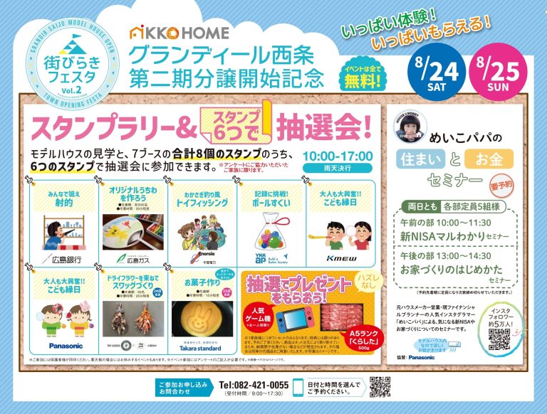 グランディール西条2期分譲を記念して、街びらきフェスタvol2を開催します! 家族で楽しめる縁日コーナー ●射的 ●オリジナル … 続きを読む 【東広島】グランディール西条街びらきフェスタvol2【8/24・25】
