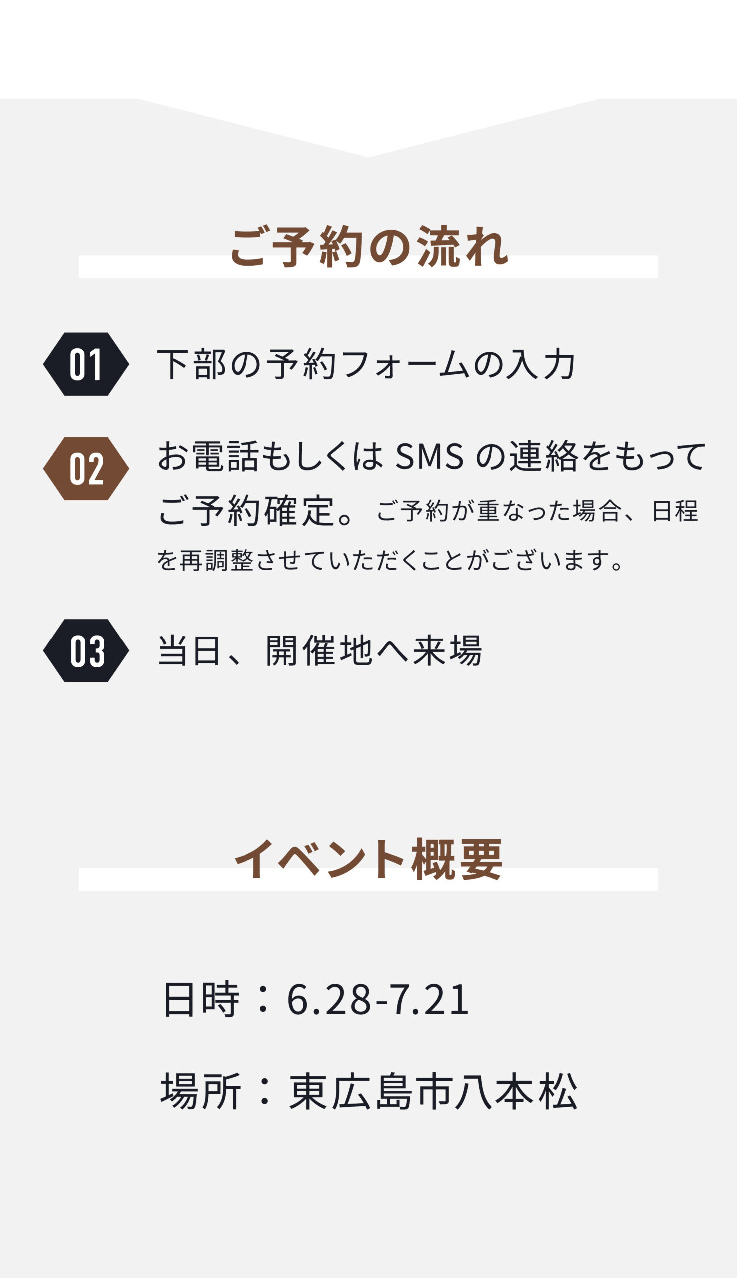 ●ご予約は、担当スタッフからのご連絡をもって確定となります。ご予約時間枠が重なった場合、日程の調整をお願いすることがございますのでご了承ください。