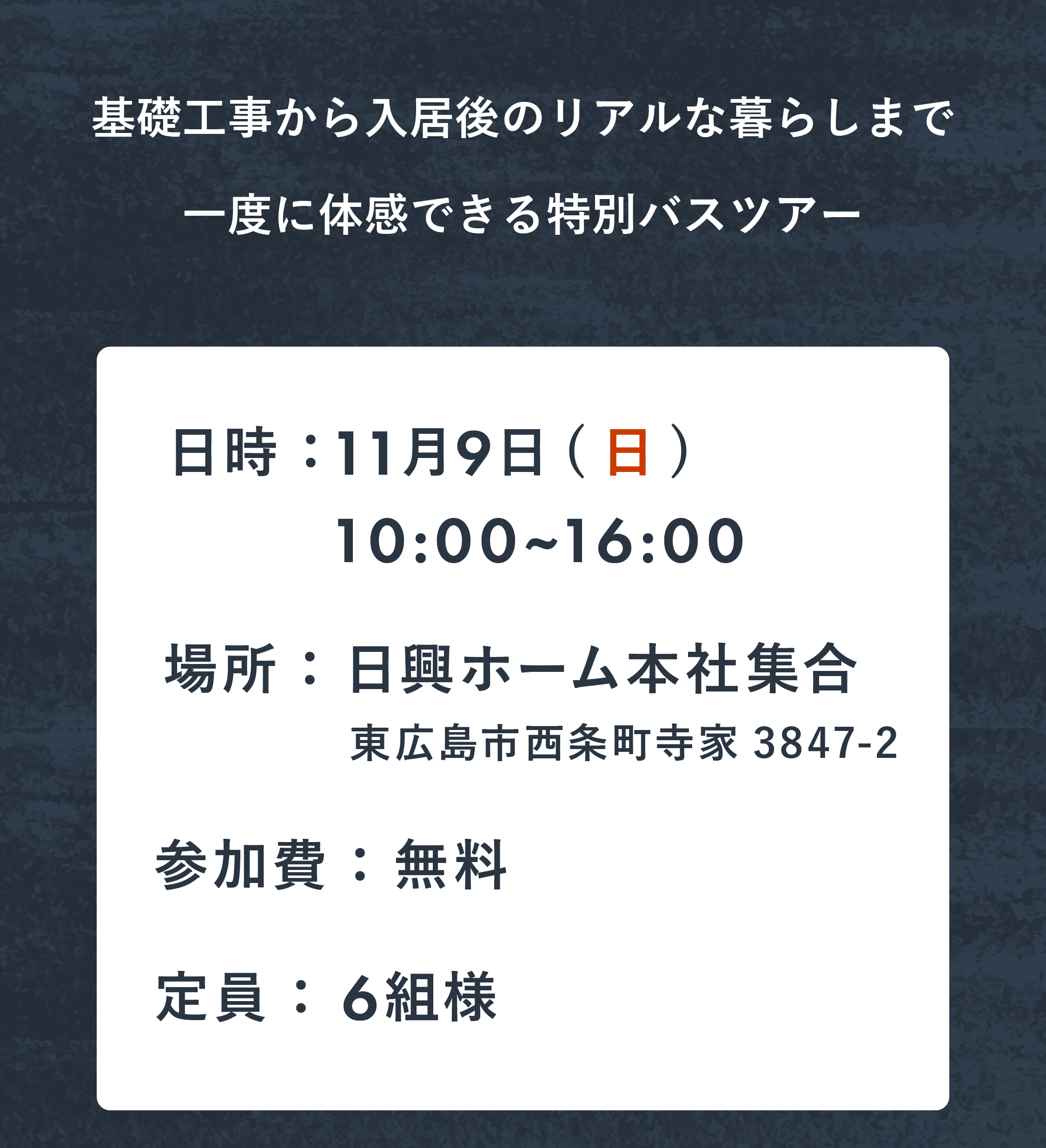 イベント名 【東広島】ご入居宅バスツアー【11.9】 希望日・時間帯 希望日 時間 10:0010:3011:0011:3012:0012:3013:0013:3014:0014:3015:0015:3016:0016:3017:0017:30 参加人数 人 お名前* ふりがな* 郵便番号(ハイフンなし)* 住所* 電話番号*(携帯電話可) メールアドレス*(携帯メール可) イベントをお知りになられたきっかけ*(複数選択可) WEBの自然検索検索結果の広告欄SUUMOInstagramInstagram広告チラシプレスネット現場や建物を見た友人・知人からその他 その他ご要望 必須項目(*)をすべて入力したのちに「送信する」ボタンを押してください。プライバシーポリシーはこちら送信する