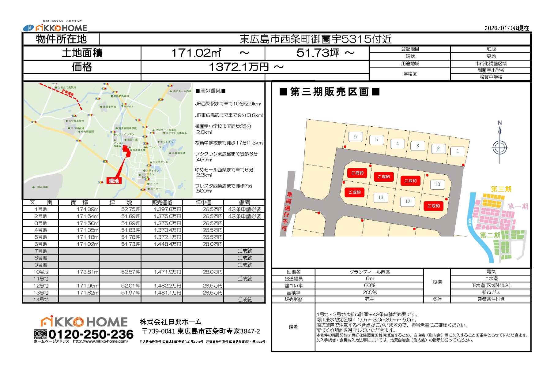 | 5号地 | 171.18㎡ | 51.78坪 | 1,372.1万円 | 26.5万円 |