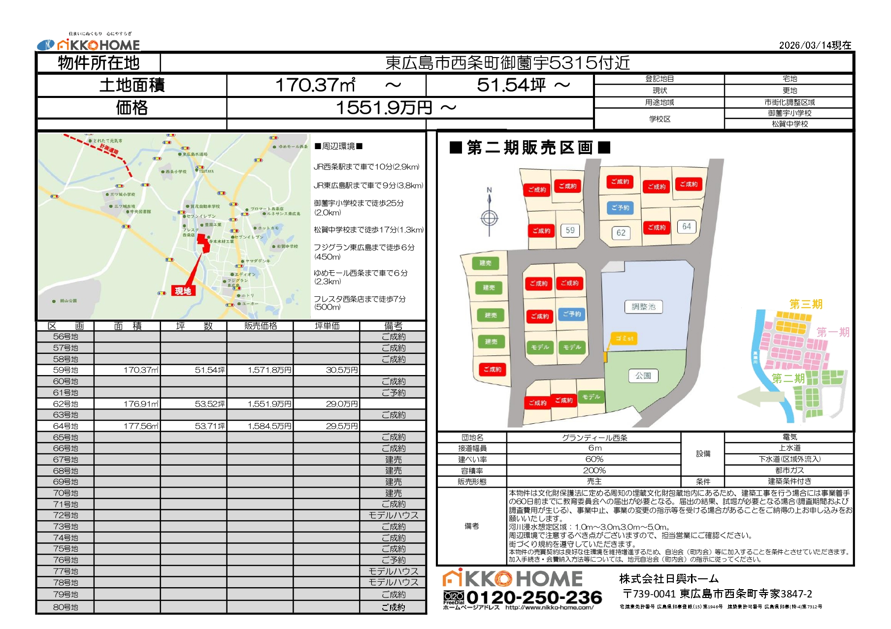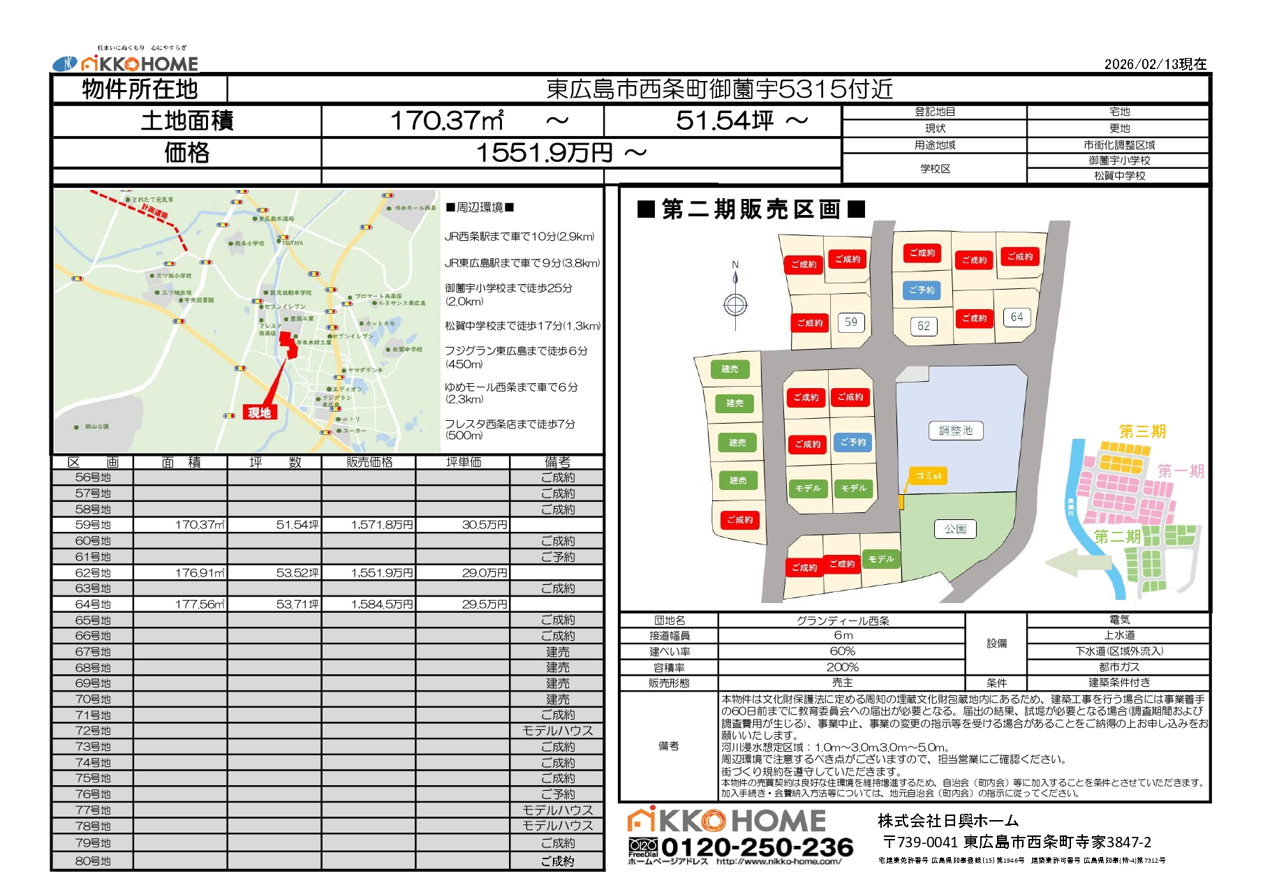 | 59号地 | 170.37㎡ | 51.54坪 | 1,571.8万円 | 30.5万円 |