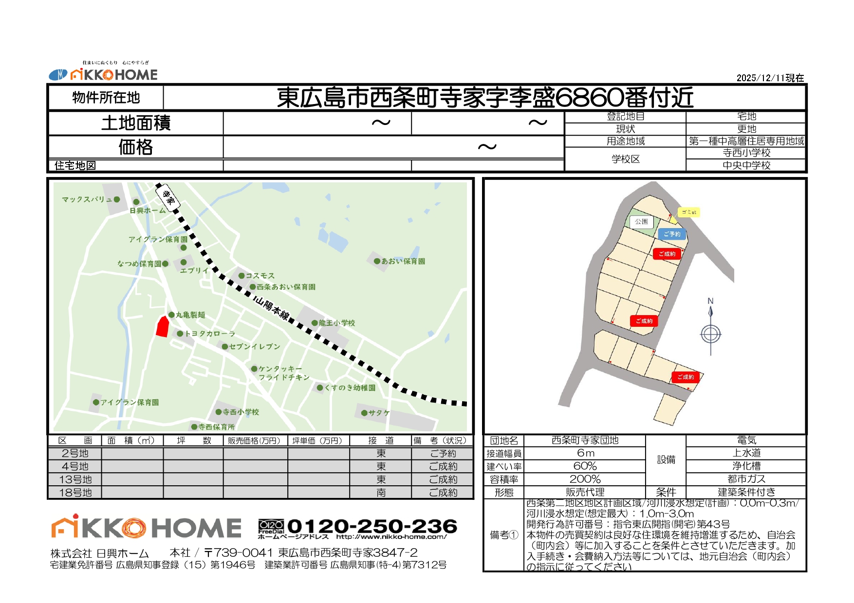 - 西条第二地区地区計画区域 河川浸水想定(計画):0.0m-0.3m 河川浸水想定(想定最大):1.0m-3.0m 開発行為許可番号:指令東広開指(開宅)第43号